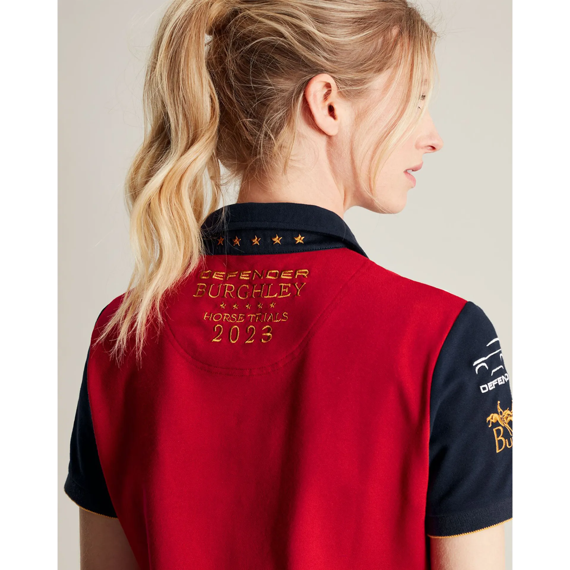 Show your love and support of the Burghley Horse Trials with the official polo shirt of 2023. The perfect thing to wear if you're attending this year's event, it has an updated colour palette which sits back with the whole collection. It has short sleeves, a button placket, a navy sash and gold event embroidery to the chest, sleeves and outer back neck. The quality can be seen through the fabric, the velvet undercollar and intricate details. Wear it for the event, and love it forever.