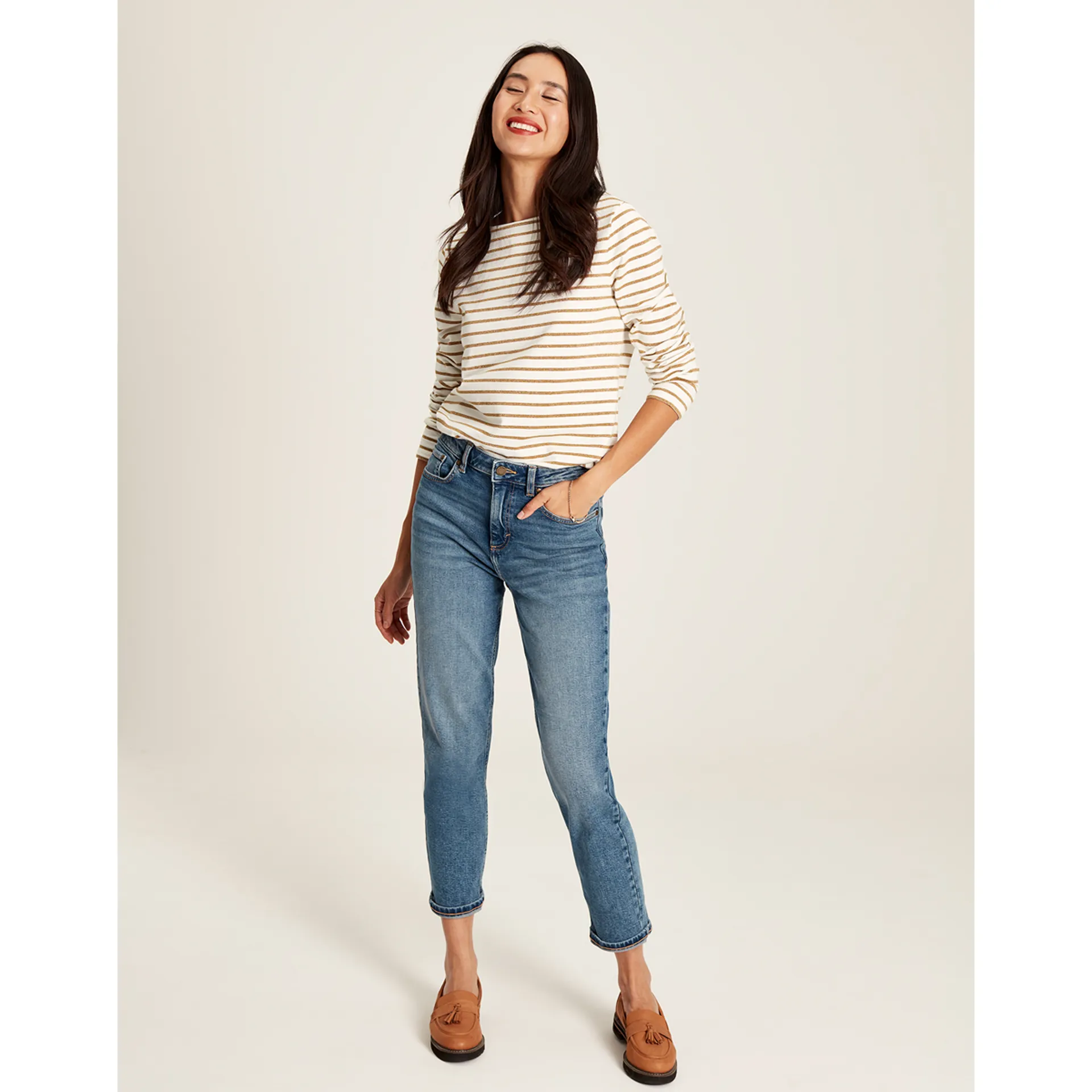 Stripe the right note with the Harbour top This classic is now new and improved for your style and comfort with an updated relaxed fit, a wider boat neck making it a great base for layering and a shorter length in the body. The horizontal stripes have been created using metallic thread adding a touch of sparkle to your style. It's finished with side splits faced with herringbone and a straight hem featuring a Joules embroidered hare. This is a true love now and forever piece.