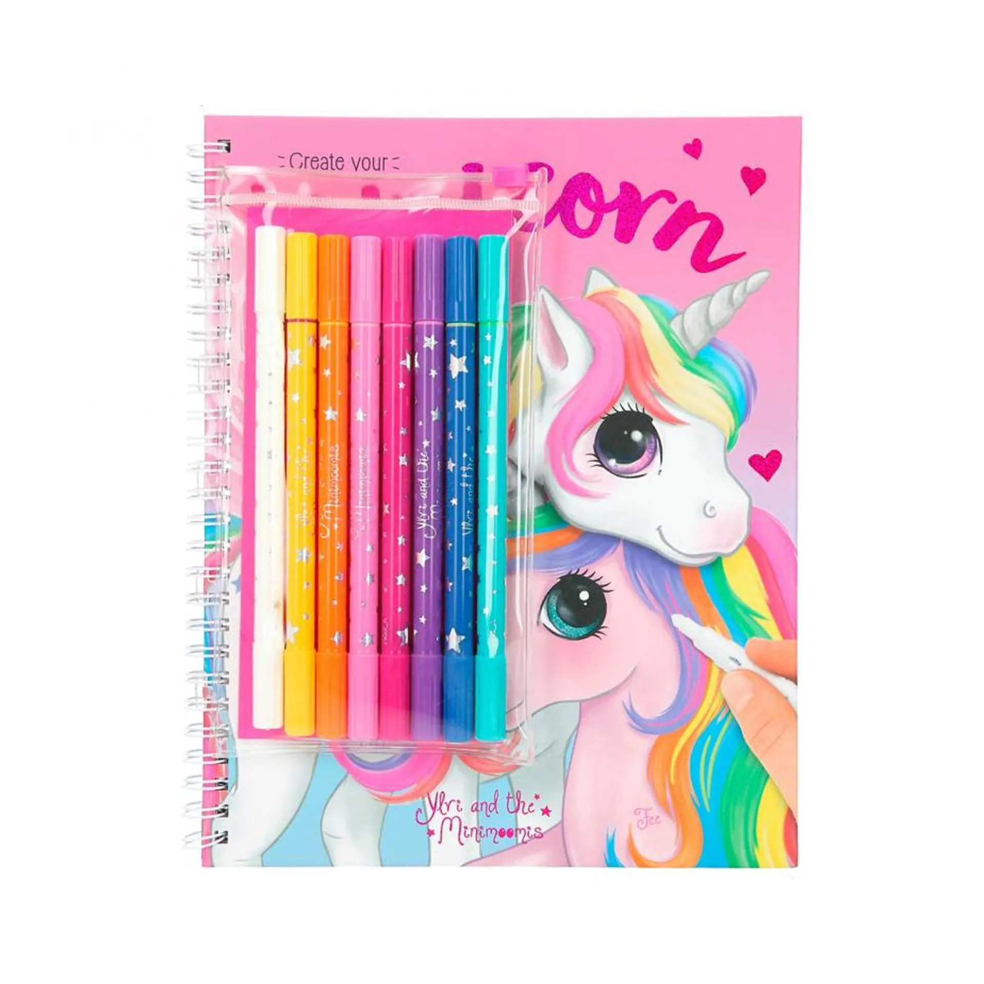 Unicorns and rainbow colours. What more does a girl want? This enchanting colouring book offers not only almost 60 unicorn colouring patterns, but also 8 matching double fibre painters: a fine tip for filigree lines and a soft, wide tip for the surfaces. And now magic comes into play. One of the pens is a magic pencil. If you paint with this pen over a different colour of the felt-tip pens, the colour changes. So you have a total of 14 different colors to make the unicorns really nice and colorful. The ring binder binding is super practical and prevents the annoying folding of the pages.