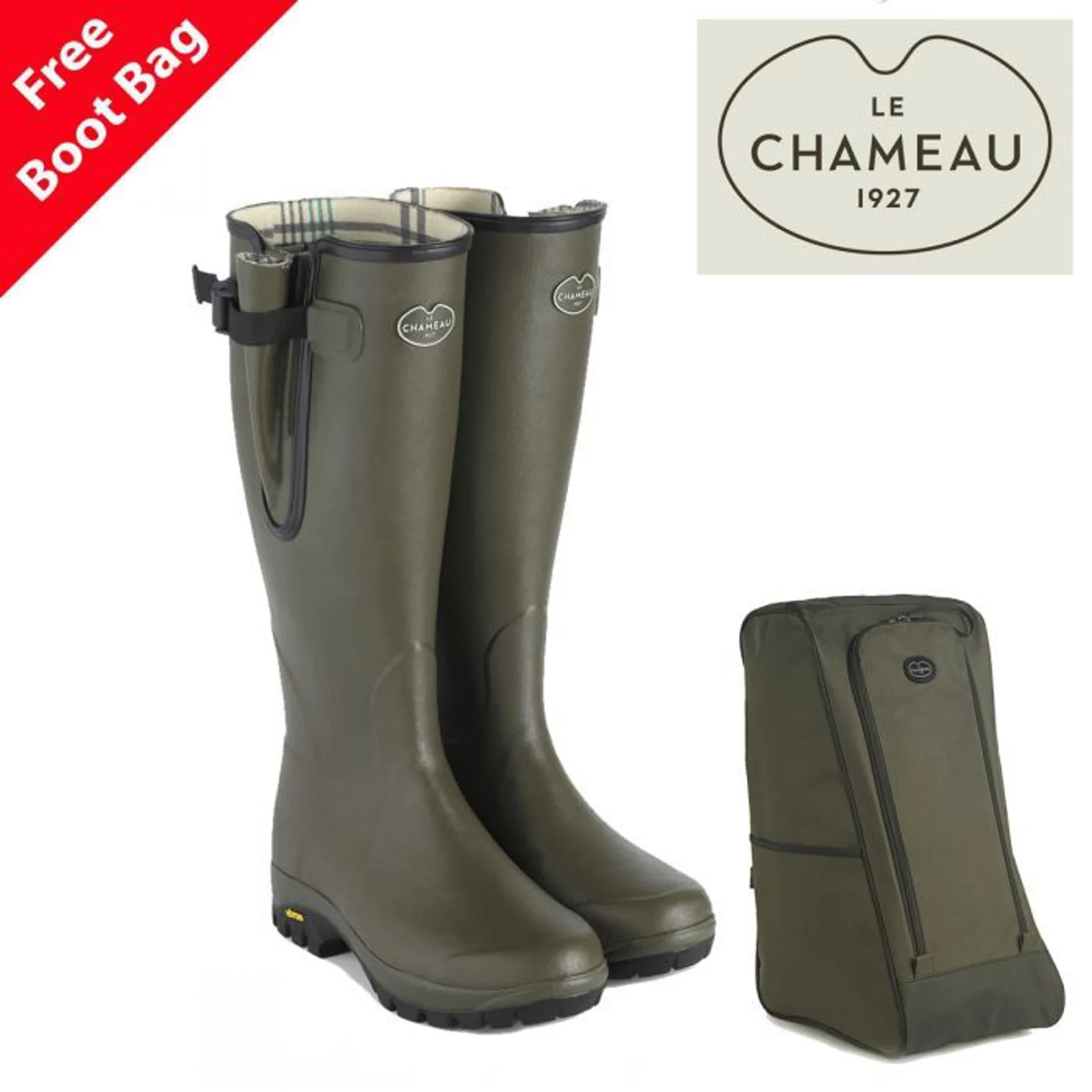 Vierzon walking rubber boot with a Vibram outsole. Handcrafted from natural rubber with a polycotton, tartan patterned jersey lining for comfortable use in warmer seasons. Adjustable waterproof gusset with snap-fastening buckle to ensure comfortable fit around the calf and leg. The specially developed Vibram sole offers excellent grip in the most challenging conditions and features a reinforced shank to protect the foot arch and prevent fatigue when walking long distances.