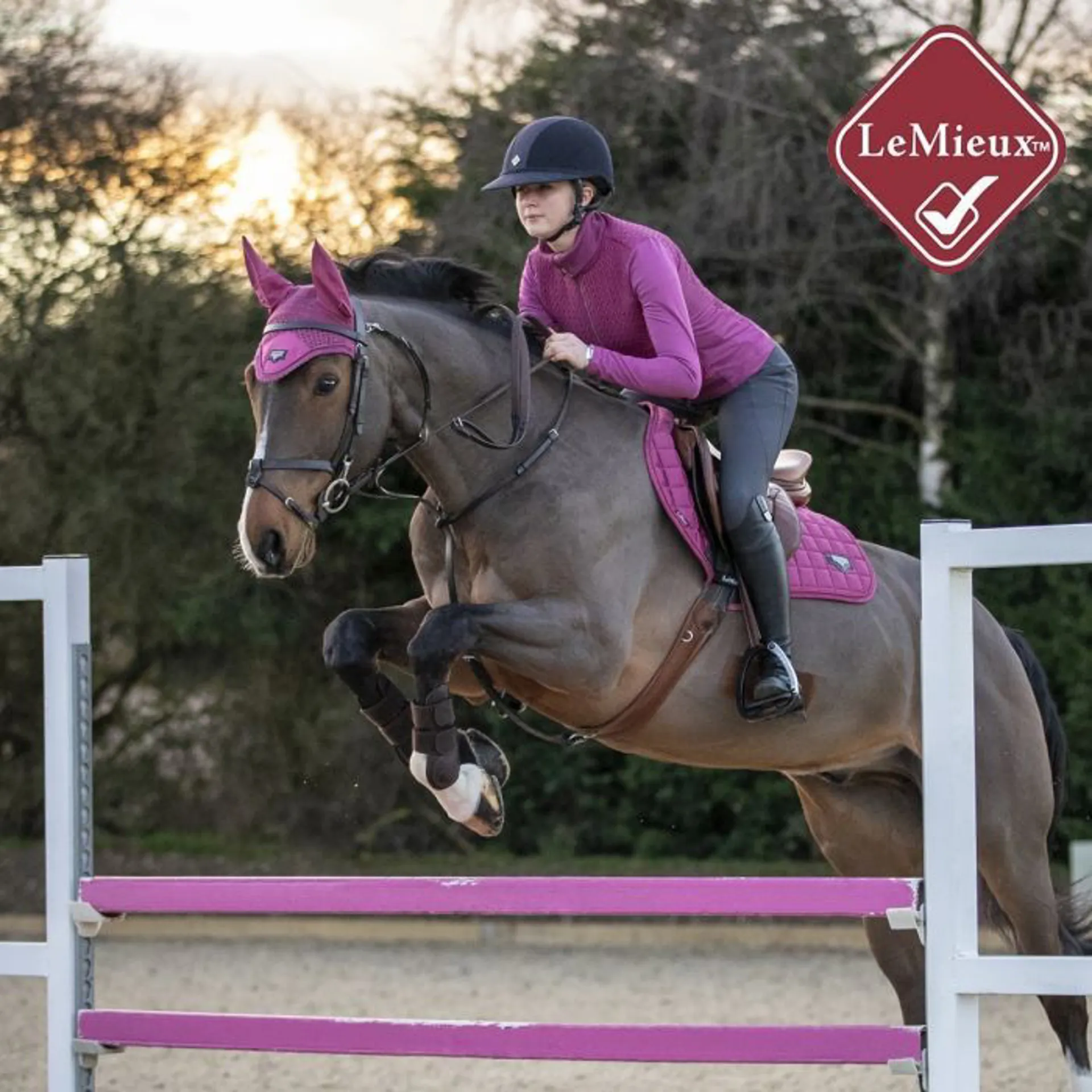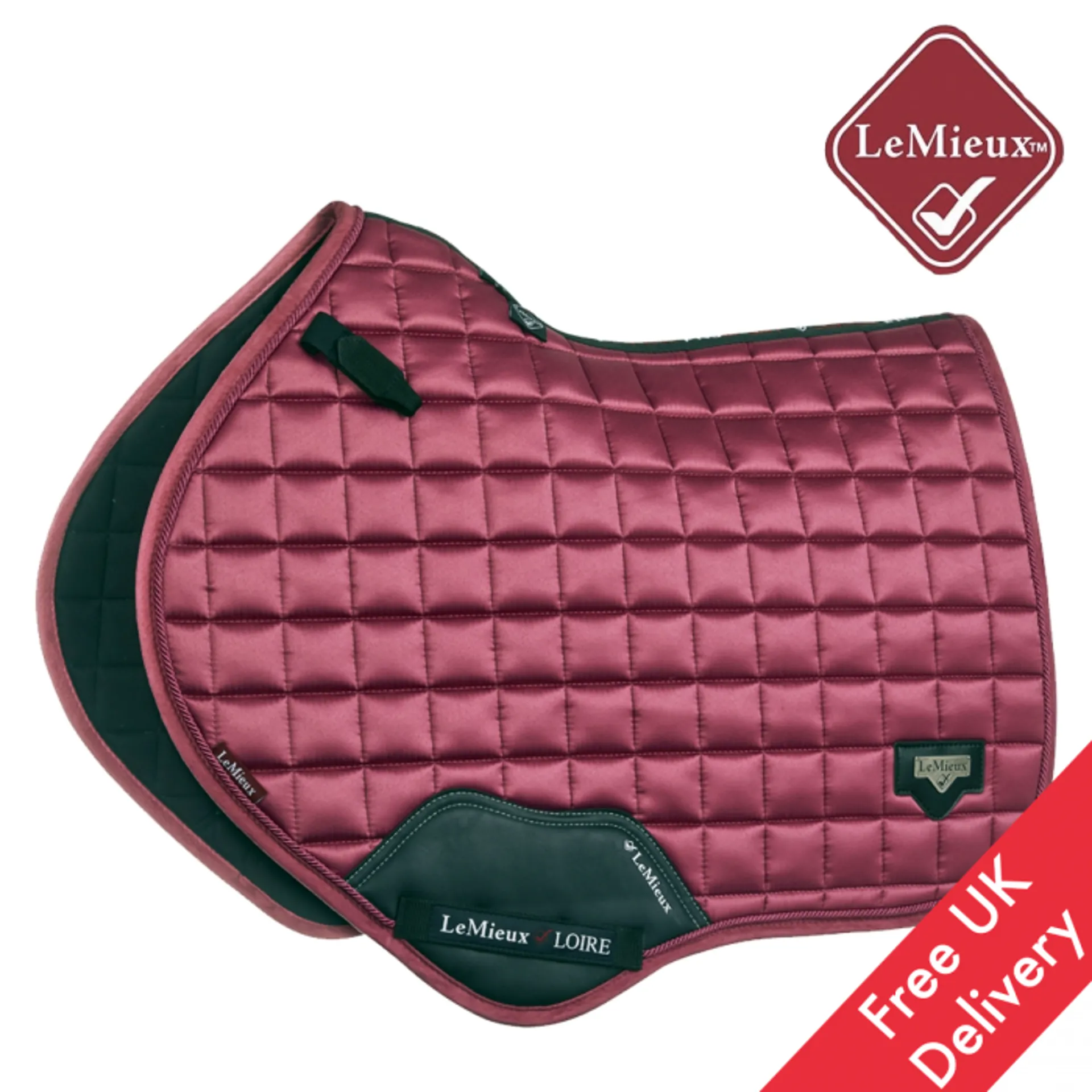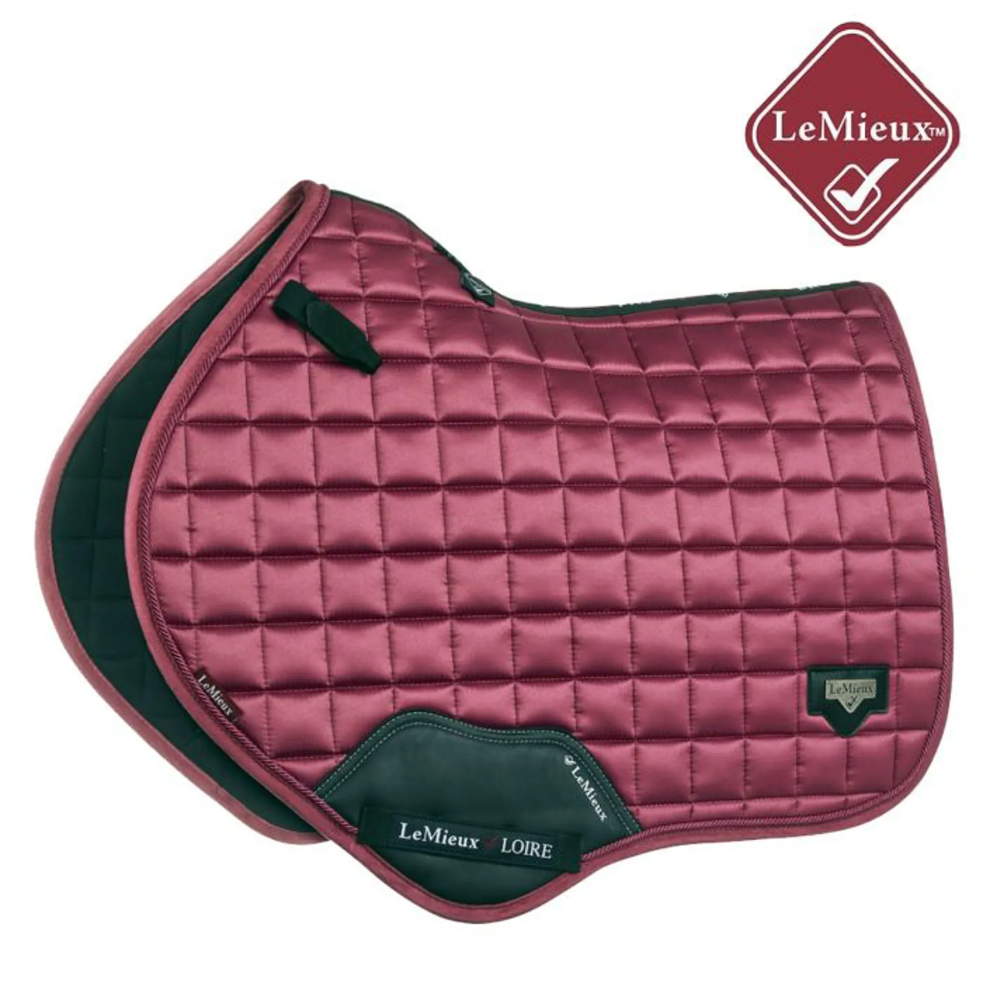 The textured pu leather girth protection area is complimented by an embossed logo and carries the usual signature LeMieux lower girth strap with its inner locking loops. The piece de resistance of the Loire Close Contact Square is its unique metal badge on a leather mount in the lower back corner