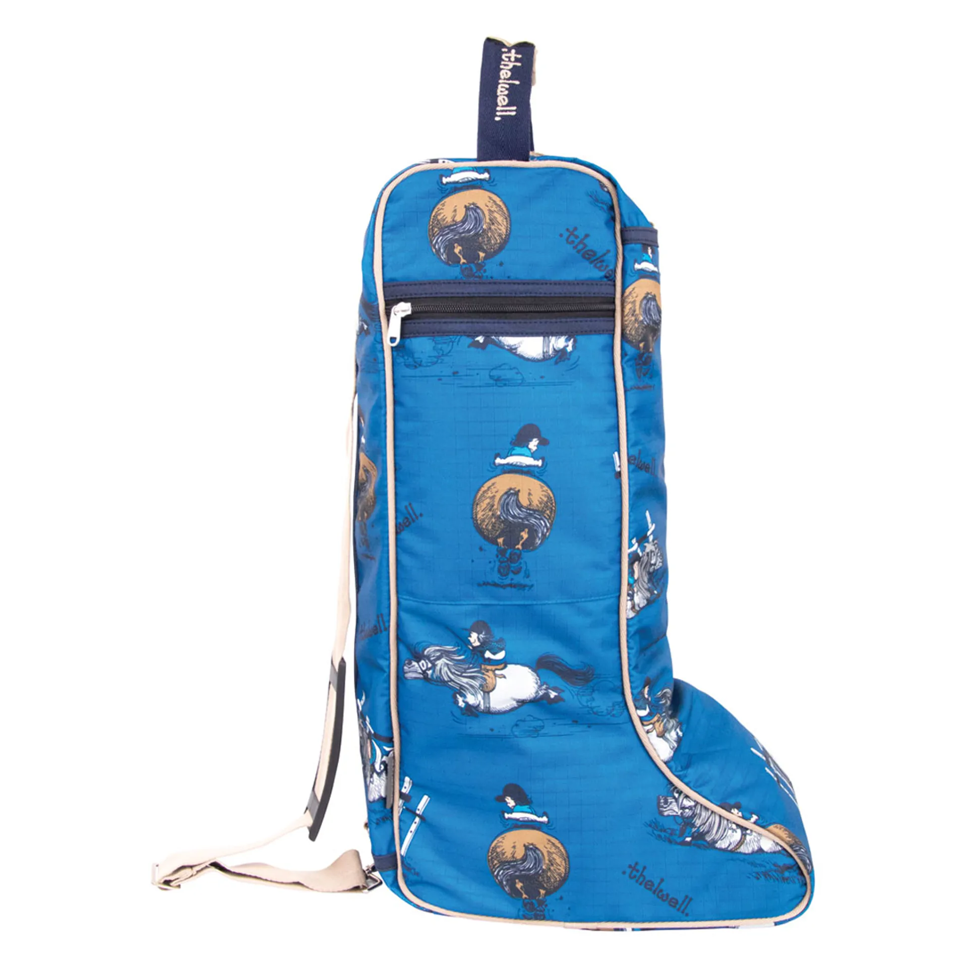 Transport and store boots in style with this smart boot bag. This gorgeous bag is covered in classic Thelwell characters and is made with a waterproof nylon outer and secured with a duo zip fastening to keep boots dry and clean. Also features a zip side pocket, grab handle and over the shoulder carry strap.