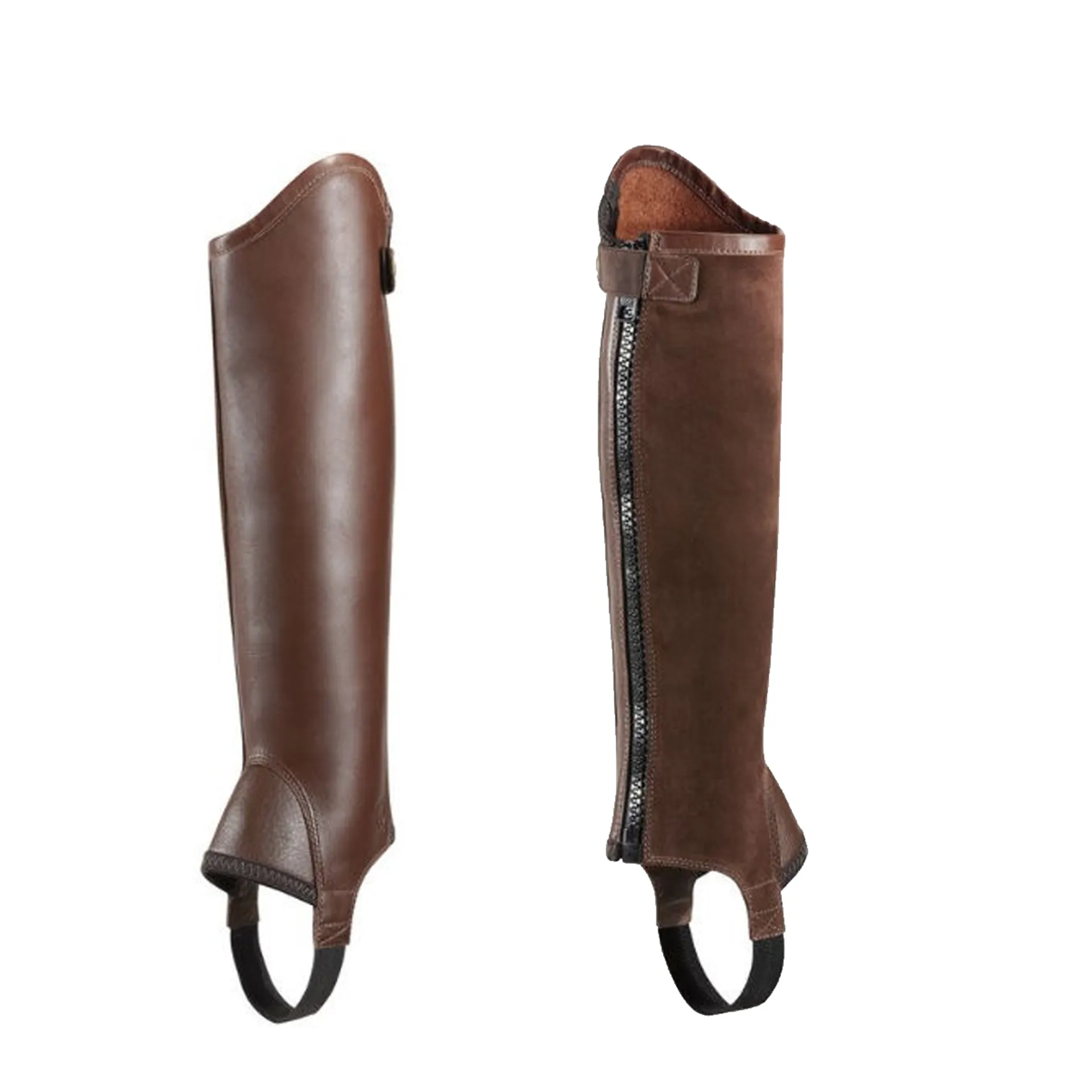 Due to the inherent suppleness of leather and the construction of these chaps, the leather will stretch with wear. These chaps should fit very snugly upon initial fitting. Measure height from floor to back of knee in bare feet. For accuracy, it is important to measure the widest part of the calf while wearing riding pants.