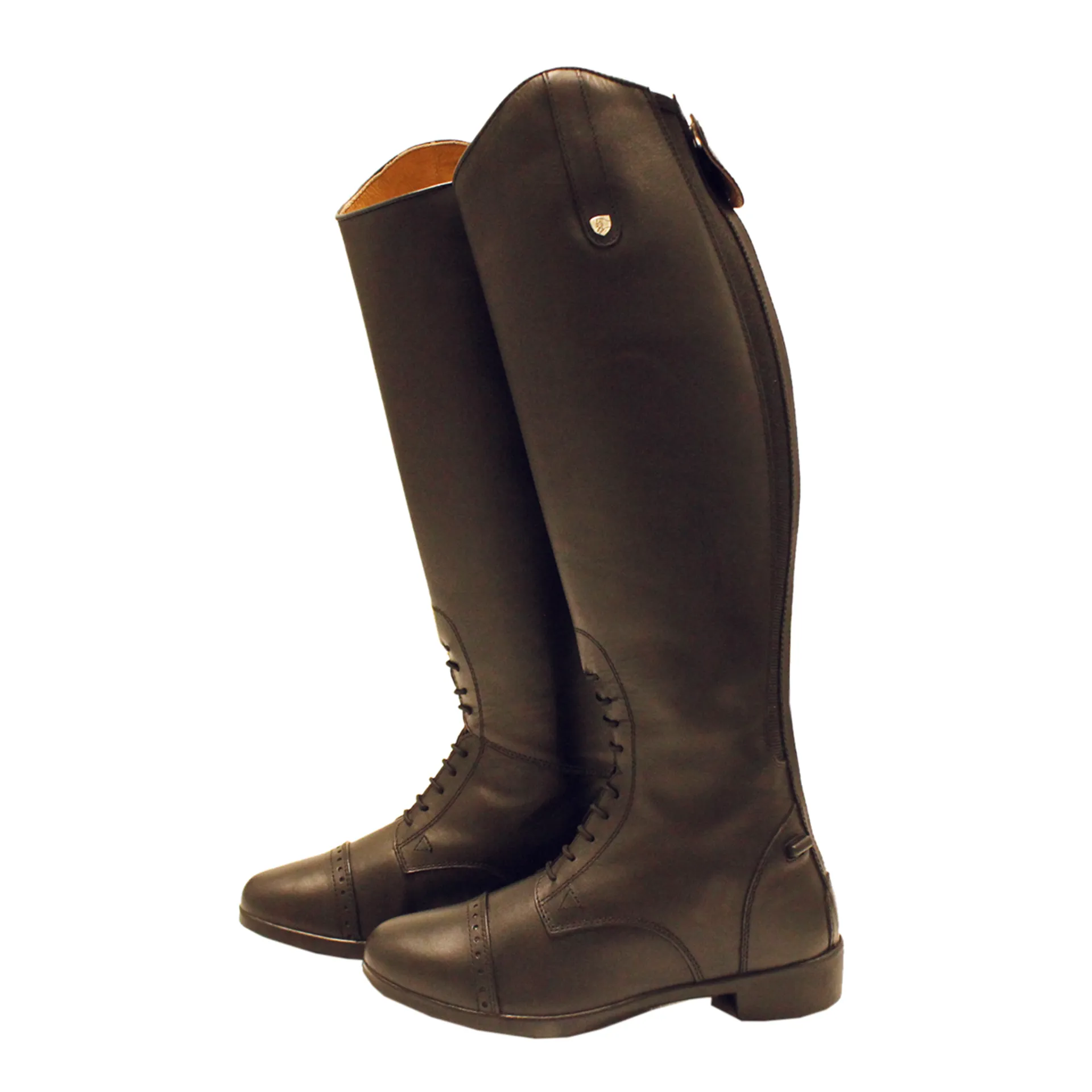 A classic pair of long riding boots in excellent quality soft leather. With a dress lace front and patterned upper. Comfortable for everyday wear and smart enough for events and competitions. Lovon sole for durability and comfort. Full length rear zip with elasticated panel and leather zip guard.