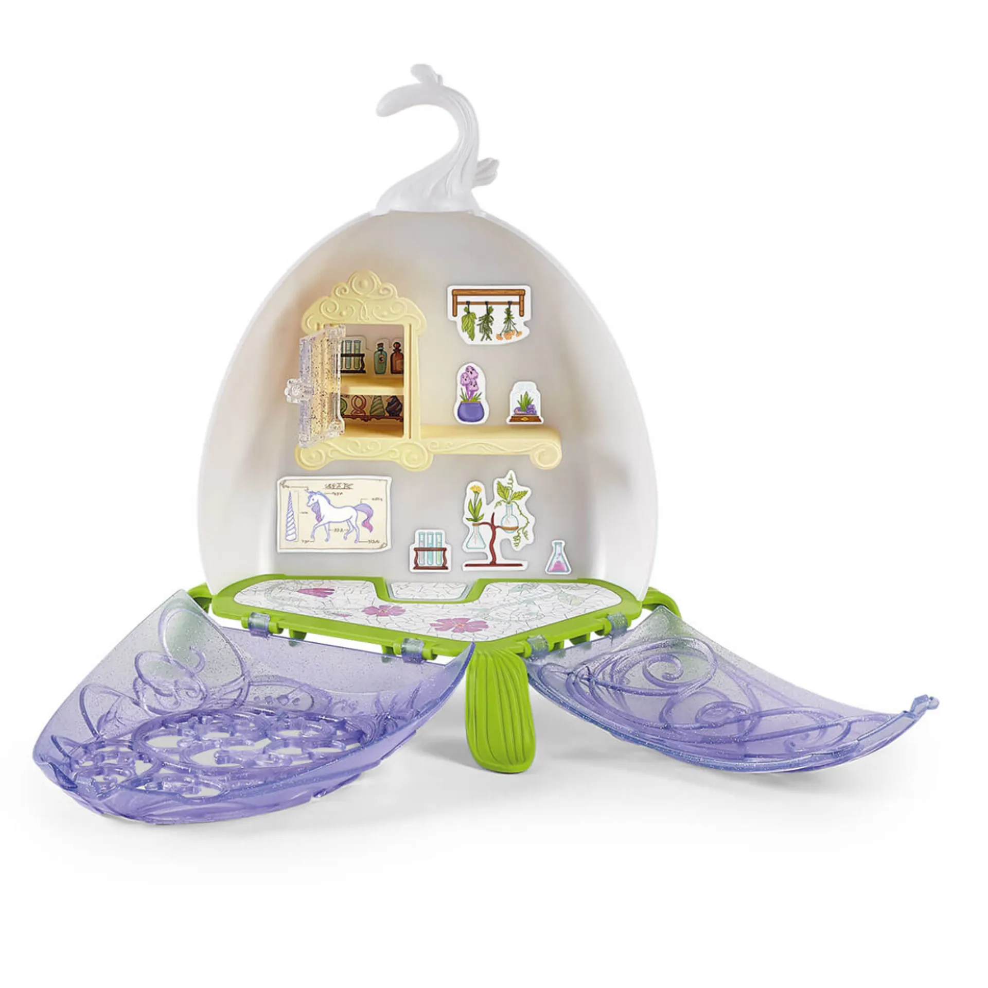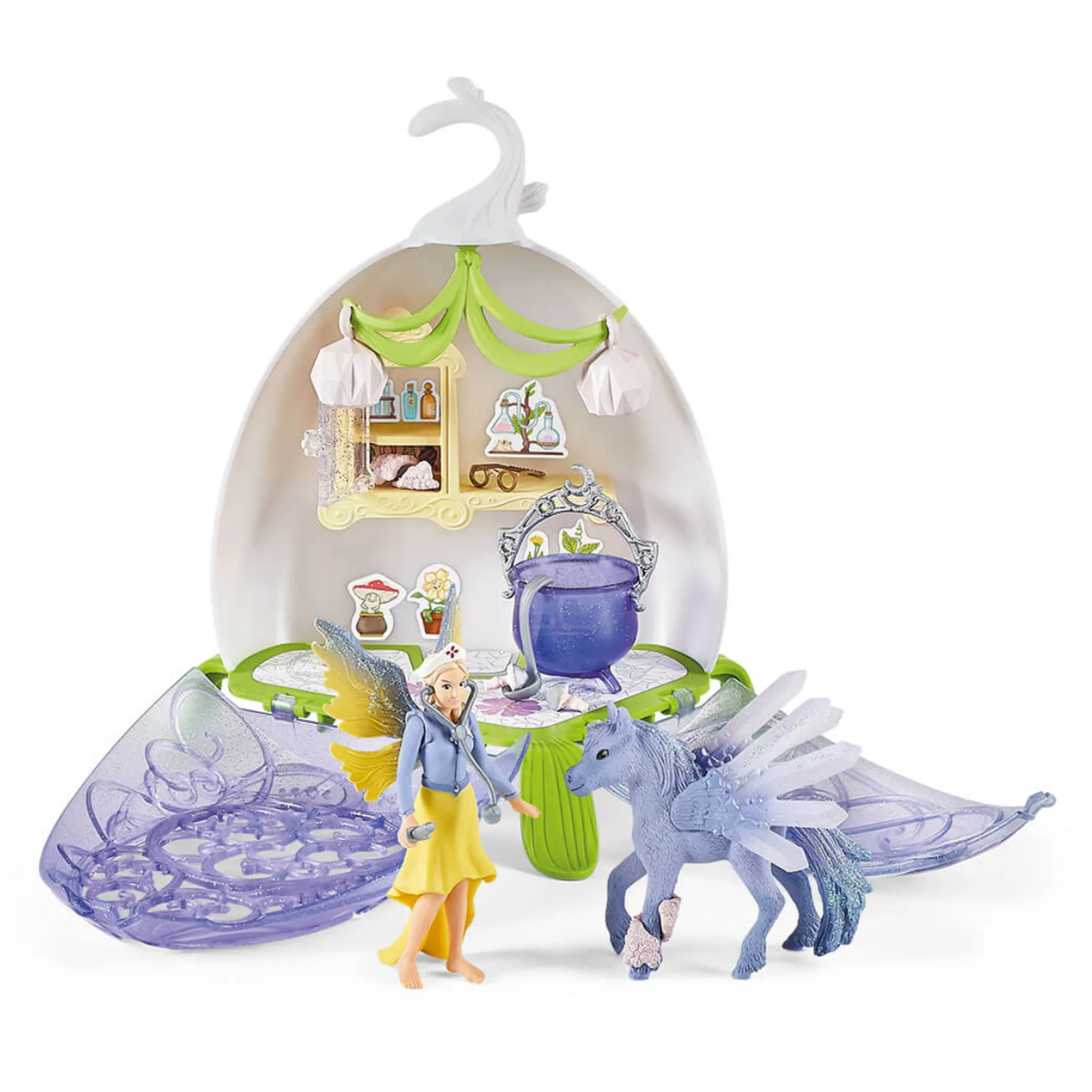 1x vet clinic with cupboard, 1x vet Sera, 1x Pegasus foal, 2x paper lantern, 1x flower garland, 1x fairy cauldron, 1x ladle, 1x glasses, 1x syringe, 1x cap, 1x stethoscope, 2x flower bandage