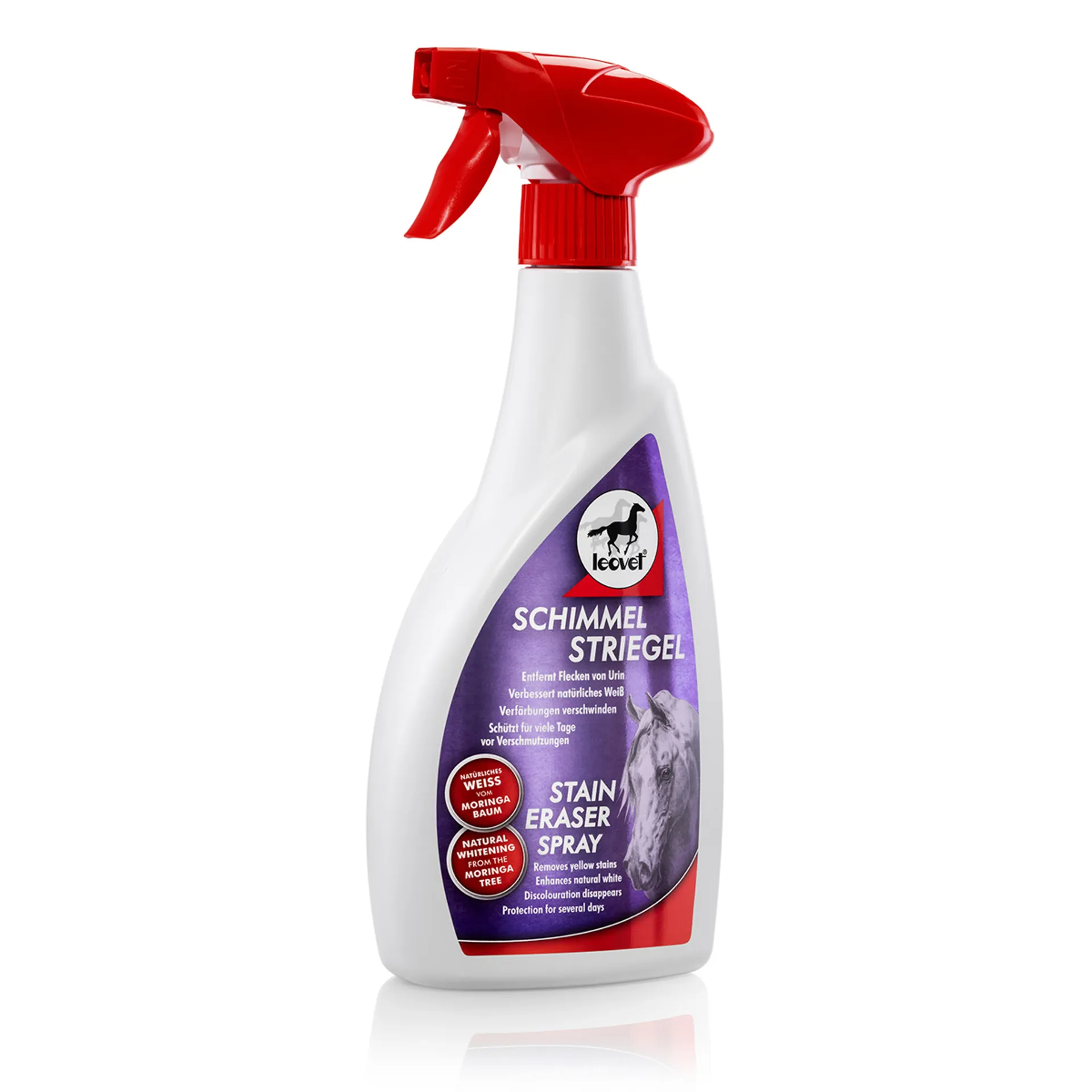 Sprayed directly onto persistent stains like urine, manure, grass ect, it helps loosen stains for easy removal. Discolouration disappears, pure white re-emerges and the shine is brilliantly enhanced. A combination of natural proteins from the Moringa tree prevent new deposits of dirt particles and discolouration.