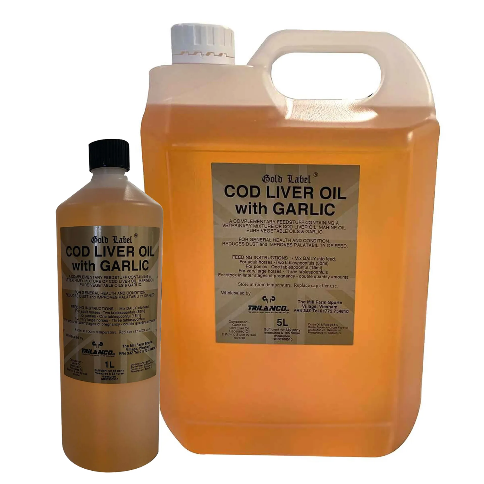 A mixture of cod liver oil, marine oils and pure vegetable oil, with the added properties of garlic oil. A stabilised source of vitamins needed for general health and condition. Ideal for show stock, young and pregnant animals. An energy source which reduces dust and also improves the palatability of feed.