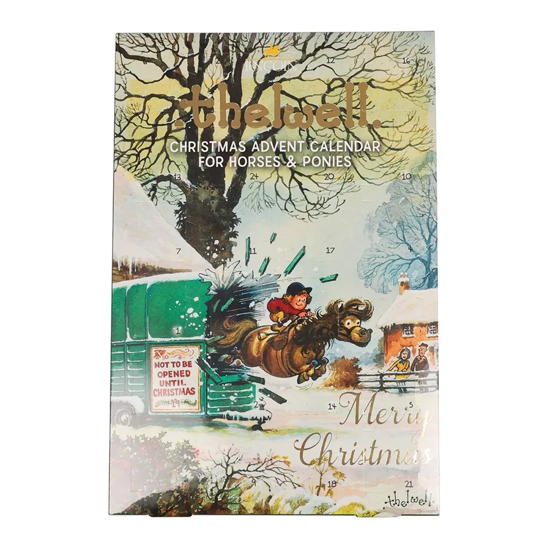Created to please Thelwell fans, old and new. A premium Advent Calendar featuring Norman Thelwell’s beloved sketch of 'Not to be opend until Christmas'! 24 Individual opening windows, each containing 2 x Lincoln Thelwell Ponio Carrot Chip Cookies. Celebrate Christmas with your best friend - Thelwell style!