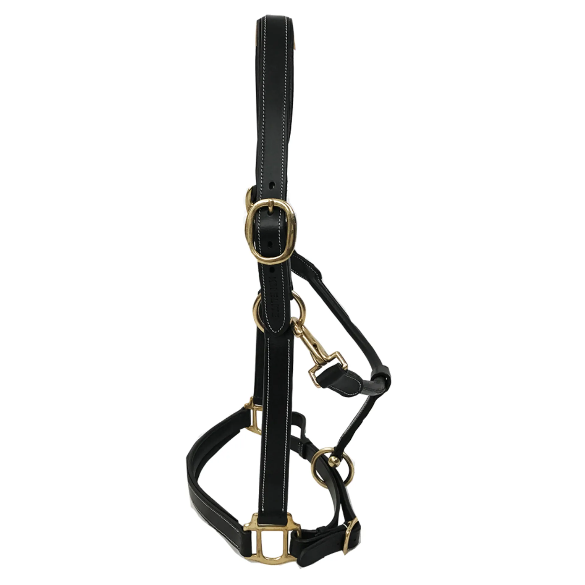 It is full adjustable with buckles on both sides of the headcollar and around the noseband. The buckles, clips and attachments are made from solid, durable brass.