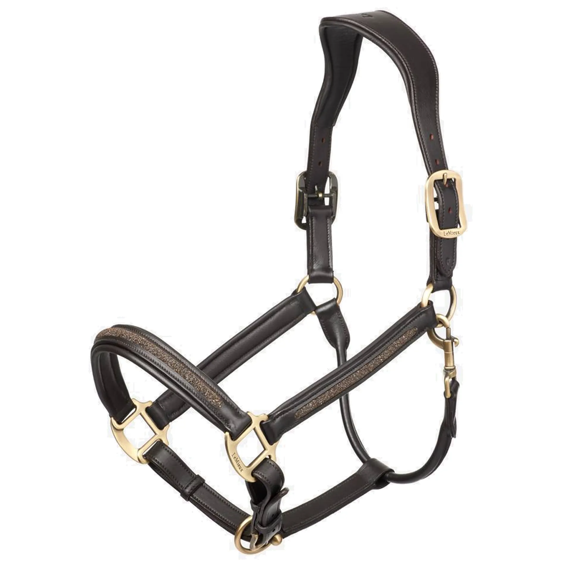This stunning leather headcollar is crafted in signature LeMieux style, ideal for travel, special events or simply elevating the everyday.Elegant inlaid crystal panel details subtly catch the light. Gunmetal metalwork with discreet LeMieux branding conveys quality.An anatomically shaped and padded headpiece and noseband ensure ultimate comfort and security for your horse.Match with our Crystal Insert Belt for an elegant coordinated look.