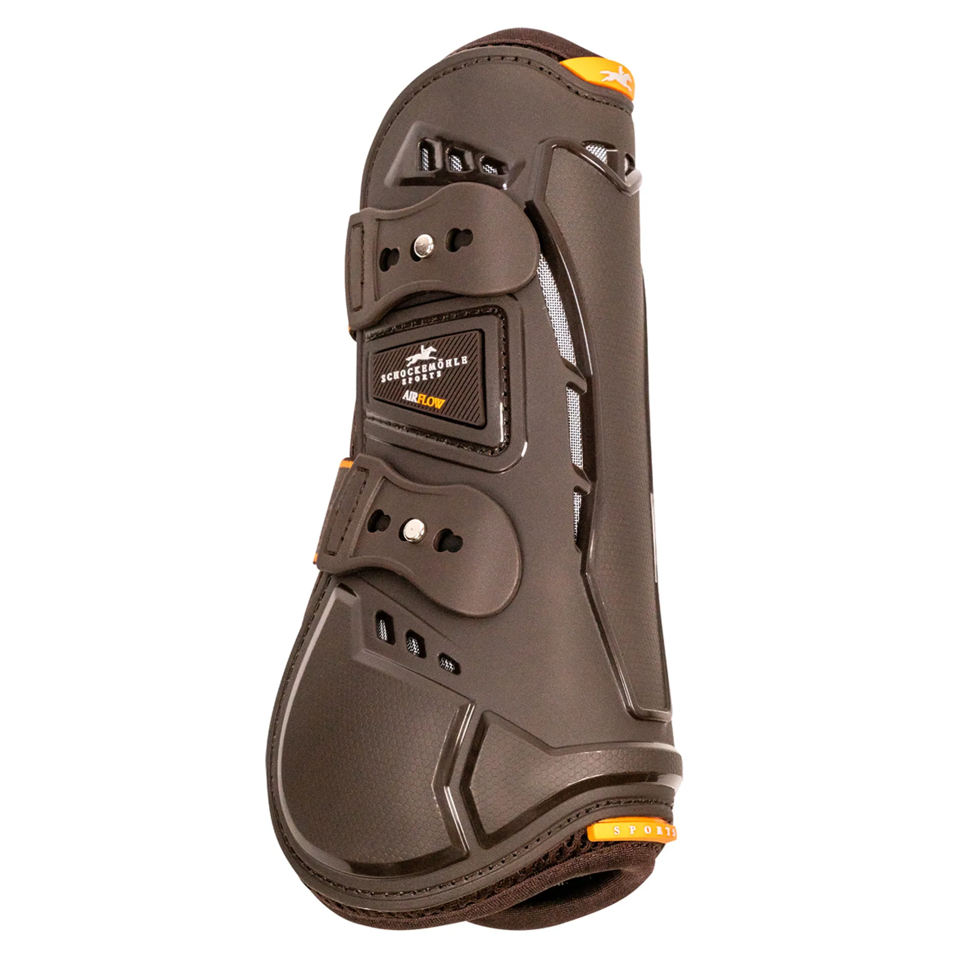 Protect the horse's legs optimally and avoid heat accumulation at the same time: The Air Flow Champion Tendon Boots from Schockemöhle Sports offer this and more! The innovative ventilation slits allow optimal air circulation on the horse's leg. Rear and side vents allow fresh air to enter from the outside,which then flows upwards around the tendons and finally escapes through the top vents. This circulation effectively dissipates heat to the outside. Time to say goodbye to heat build-up in this sensitive area! At the same time, anti-allergic bamboo lining directly on the horse's leg promotes blood circulation and ensures an even body temperature. Bamboo as well as the overlying mesh are also breathable. The anatomically shaped TPU shell as well as the integrated Impact EVA foam stabilise tendons and ligaments of the horse's leg and have an optimal shock-absorbing effect. The boots optimally protect the horse's leg from shocks and impacts. The double pin closure proves to be practical in use - these gaiters leave nothing to be desired, neither in terms of functionality nor design!