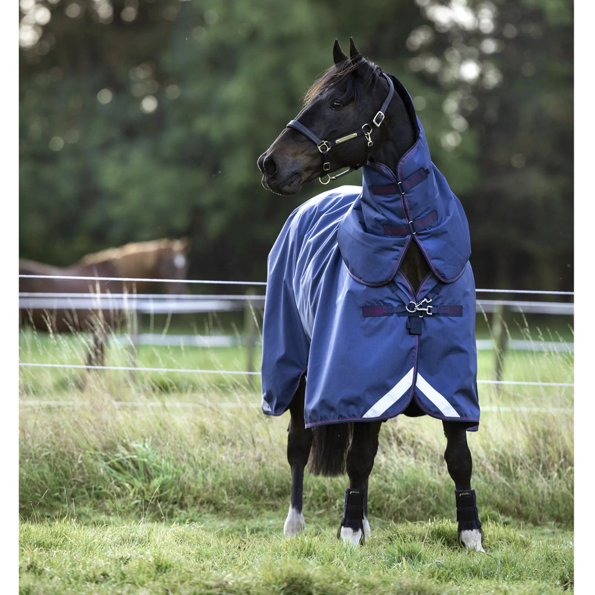 A tough 1000D Ballistic Nylon turnout rug which is not only big on design, fit, and performance but designed exclusively for your bigger-built horse to ensure optimum comfort, maximum coverage and exceptional freedom of movement.The Optimo's Articulated Pivotal Dart detail follows your horse's movements, whether at play or when grazing. This unique design detail includes a carefully positioned dart above and behind the shoulders to allow your horse to enjoy his field time, however exuberant!This innovative design element offers your horse an exceptional range of movement while preventing the rug from pulling forward or slipping. Other comfort and movement-enhancing details include our Surefit Neck Design with a V-Front Closure system, dual leg arches and three straight removable surcingle straps incorporating the Rambo® Safety System.Complete with a removable neck cover, machine washable care label and 400g liner, and further compatibility with the Optimo liner range, it gives you even more flexibility as a horse owner with just one rug outer.Reflective strips and wipe-clean PVC tail cord finish this rug, which comes with the Rambo® three-year guarantee on waterproofness, breathability, and hardware. Quality you can depend on!