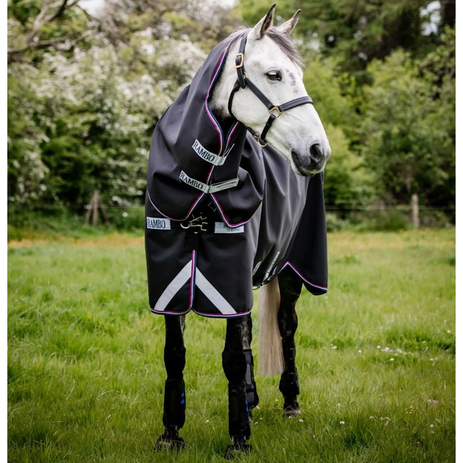 The ultimate waterproof turnout, now even stronger than before! TheRambo® Supreme 1680D Vari-Layer Turnout (250g Medium)has an impressive 1680D Ballistic Nylon waterproof and breathable outer, 120% stronger than our standard 1000D Ballistic Nylon!Our Vari-Layer design integrates 250g of Thermobonded fibrefill to offer your horse maximum warmth with minimal weight in this impressive turnout rug. Our skin-kind embossed lining is shine-enhancing with anti-bacterial and anti-static properties. The contoured detachable hood and integrated liner loops, compatible with the extensive liner collection, offer greater flexibility and choice.Our Surefit Neck Design with V-Front Closure and leg arches offers your horse enhanced freedom of movement to move, play and graze. Reflective strips, wipe clean tail cord, and three crossed removable surcingle straps incorporating the Rambo® Safety Surcingle System complete this rug.This rug comes with the Rambo® promise, a three-year waterproof & breathability guarantee and comes in a reusable protective 'Bag for Life' for practical rug storage!Demand more from your winter turnout rugs and choose the best your horse can get with the Rambo® Rug Collection from Horseware®.