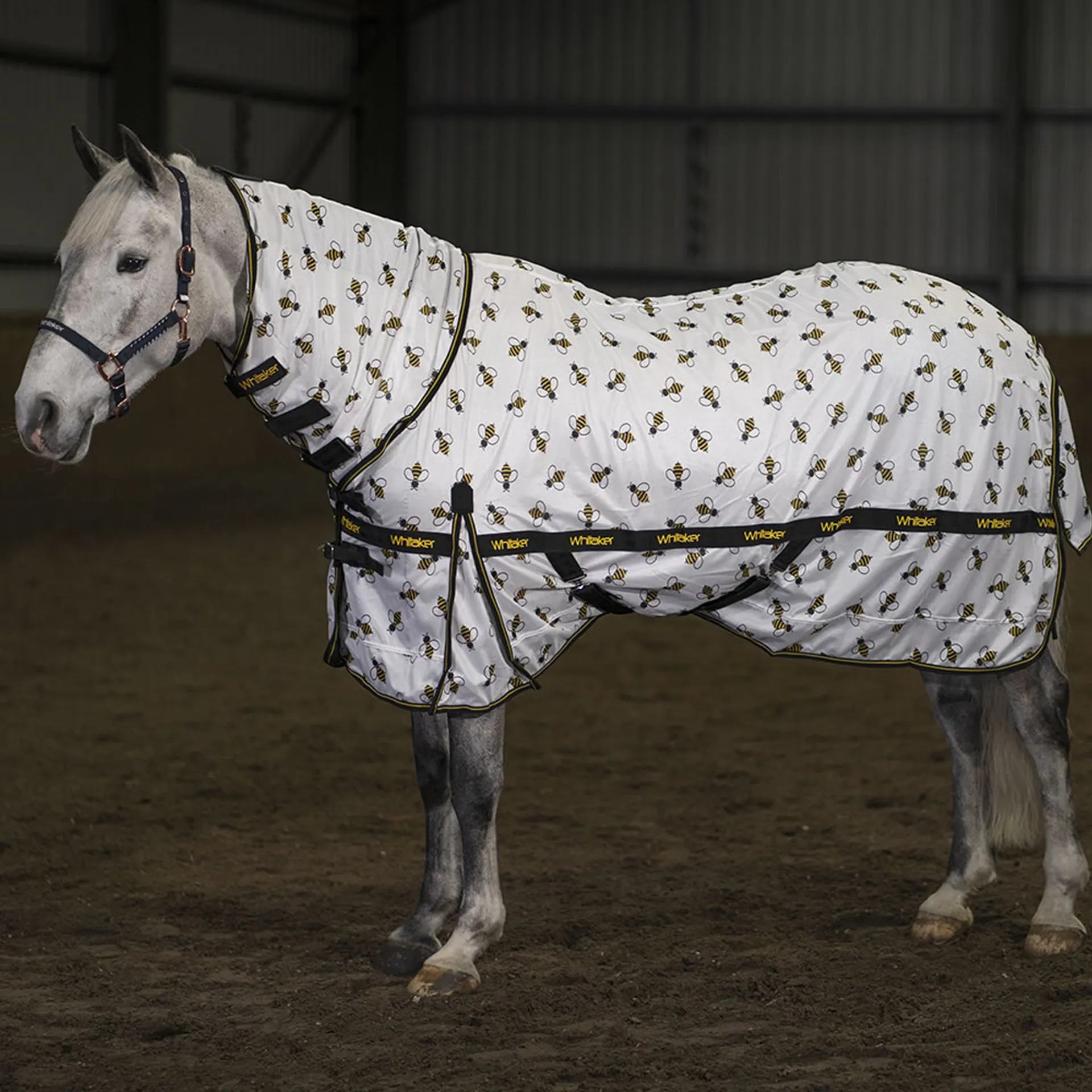 A summery yellow bee print fly rug. Featuring crossed belly surcingles, two buckle chest fastenings, three velcro straps on the neck and a fillet string.