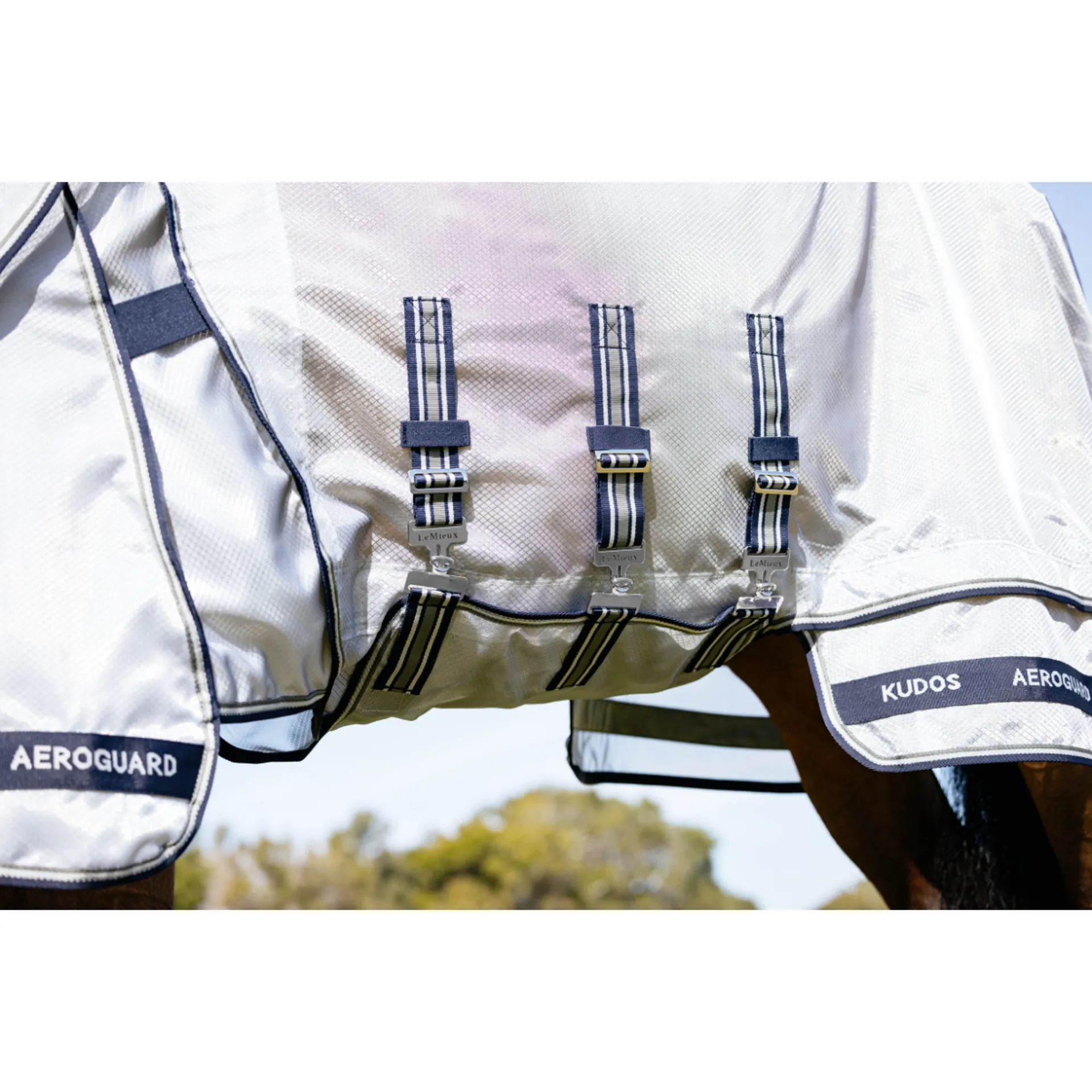 The Kudos AeroGuard Fly Rug is the ultimate technical fly defence. Crafted in ripshield mesh, it's engineered in durable nylon and monofilament polyester for a structure that shapes around your horse's body to protect them from flies.The structured yet lightweight ripshield mesh makes this fly rug highly breathable, naturally repelling water and encouraging rapid drying. The extended, shaped belly flap maximises coverage and features a three-strap closure with a detachable central strap that helps to self-right the rug.The design registered angled front fastening system distributes pressure to prevent rubbing on the shoulder and across the chest. Antibacterial and anti-static, it's ideal for all-day comfort. Our patented two-part skirt provides a break in the hemline and relieves tension allowing for a greater range of movement.