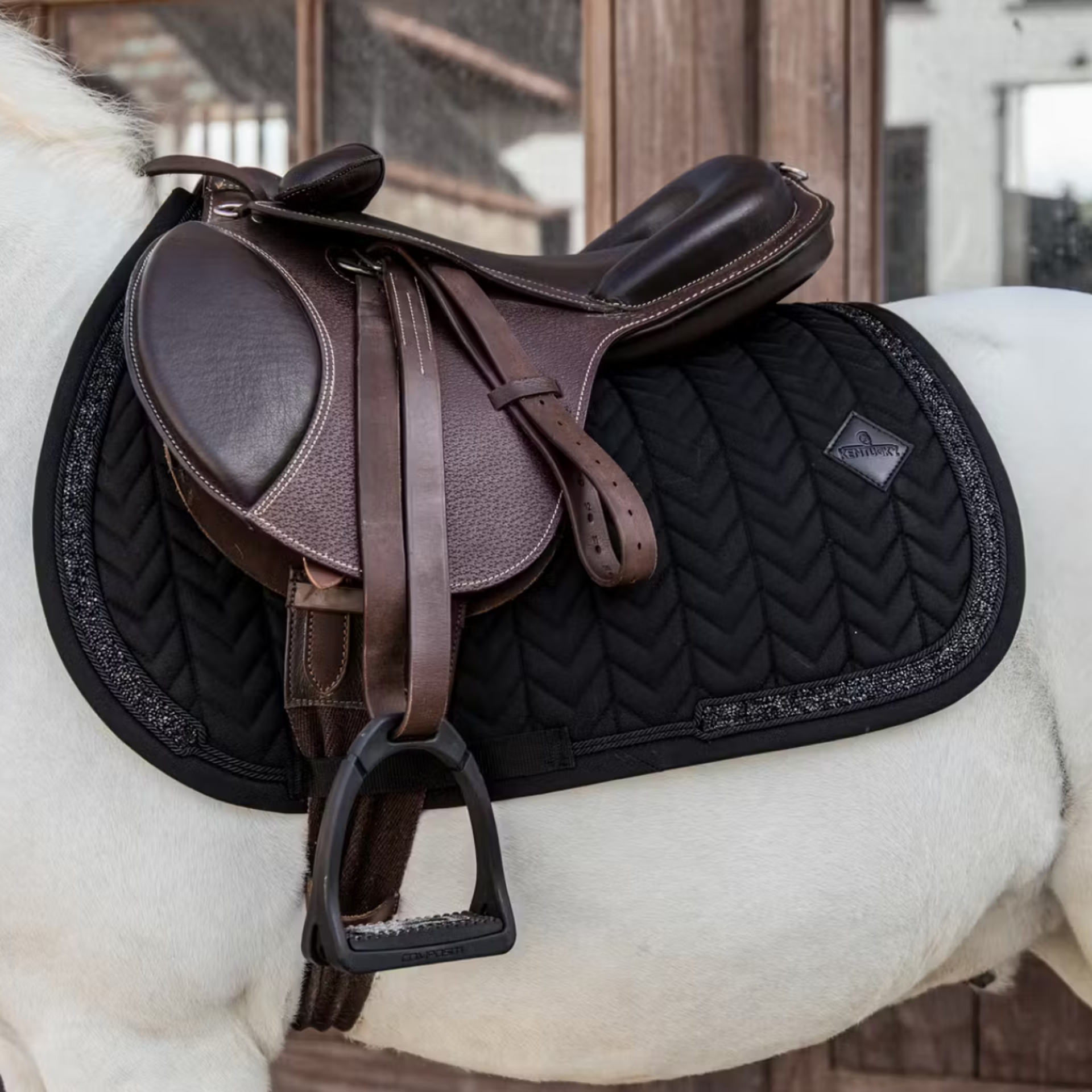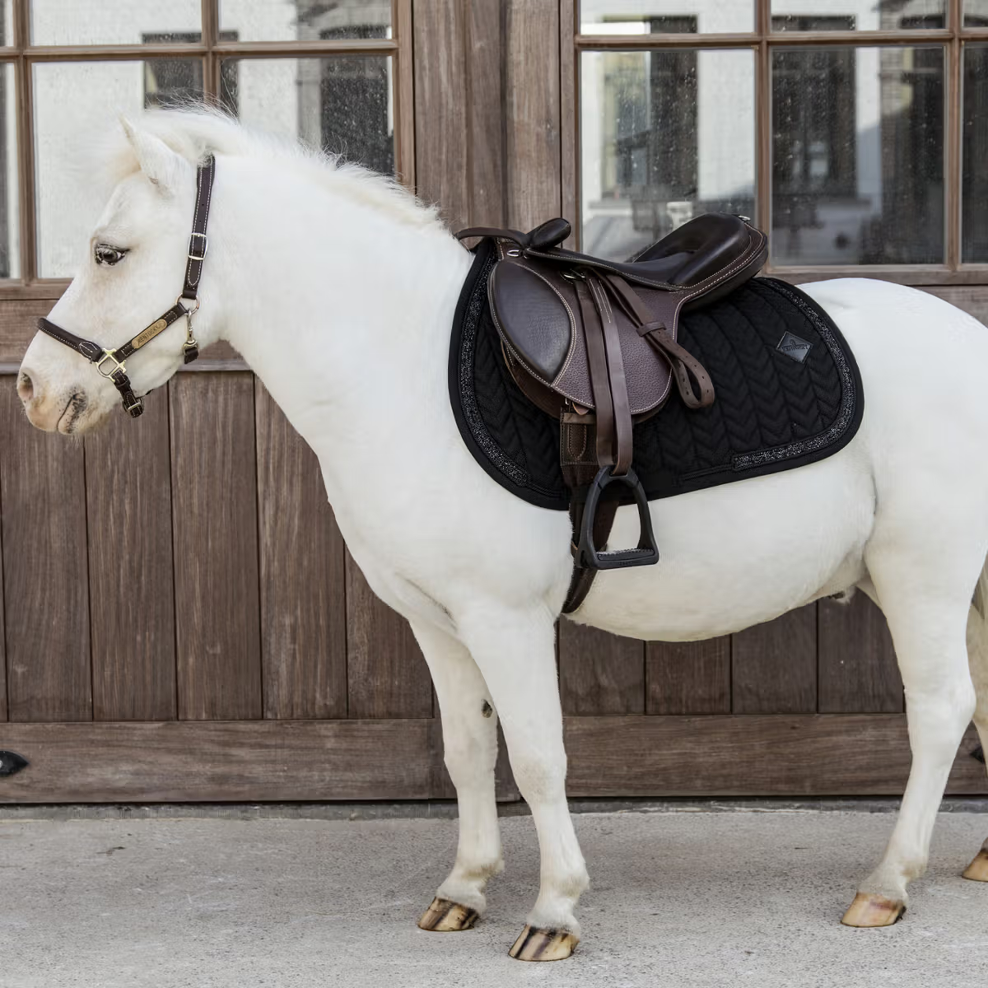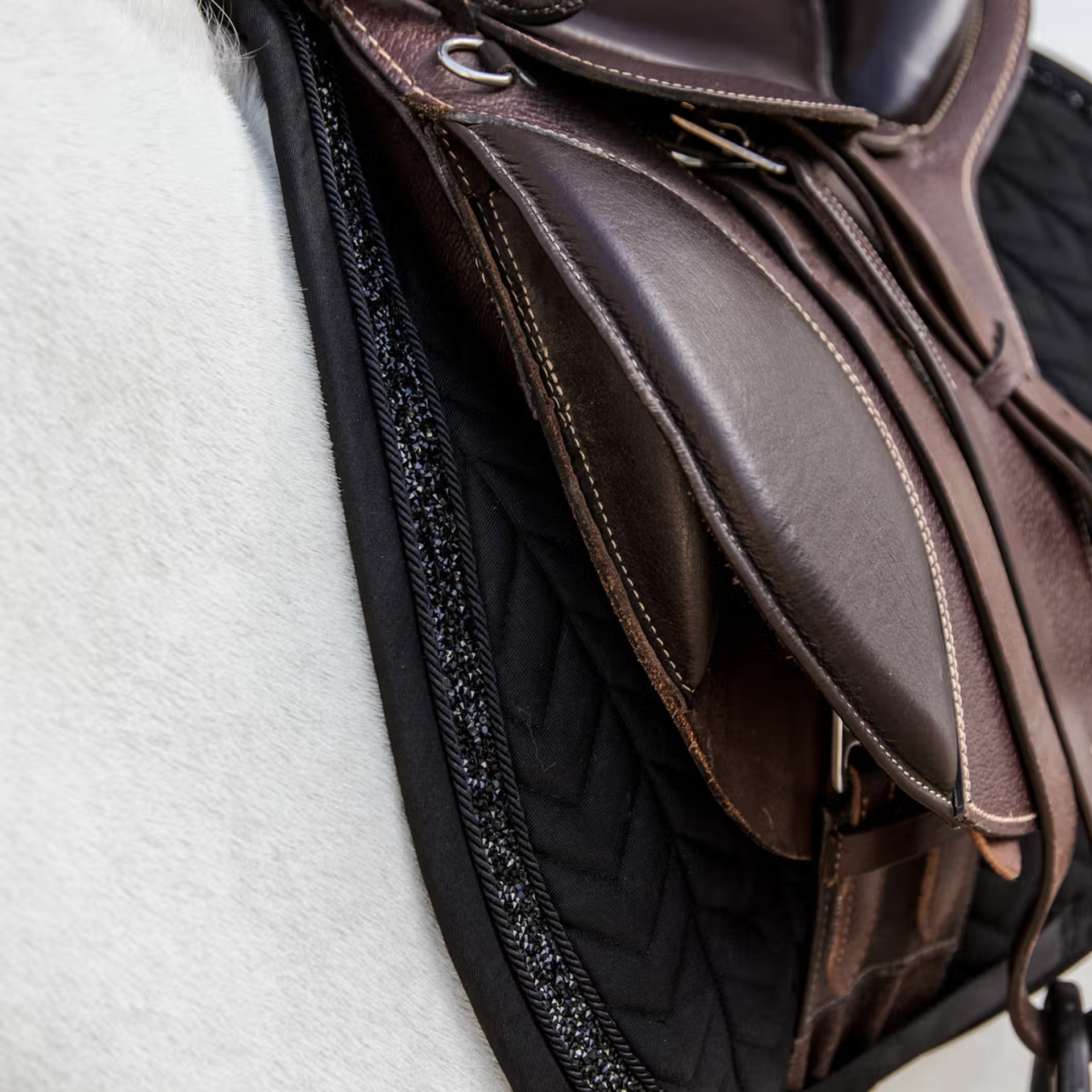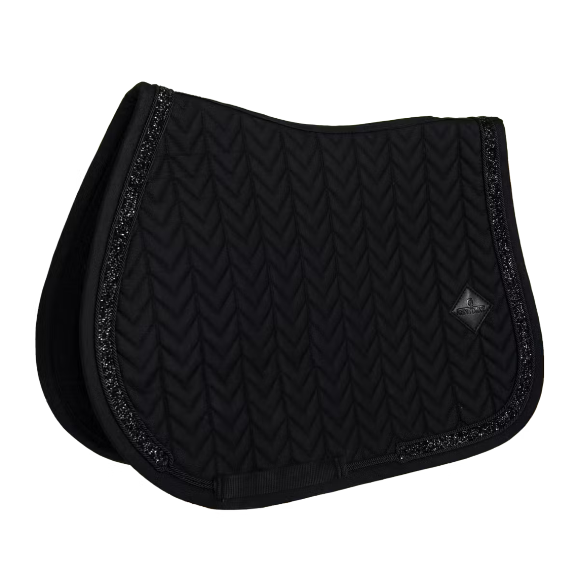 Fabrics & materialsThis saddle pad has a unique fishbone quilting and features a stunning Glitter stone binding.