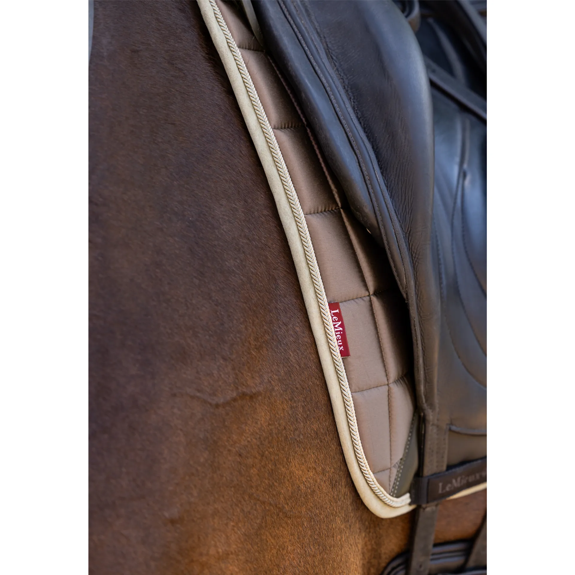 The textured PU leather girth protection area is complimented by an embossed logo and carries the usual signature LeMieux lower girth strap with its inner locking loops. The piece de resistance of the Loire Dressage Square is its unique metal badge on a leather mount in the lower back corner.