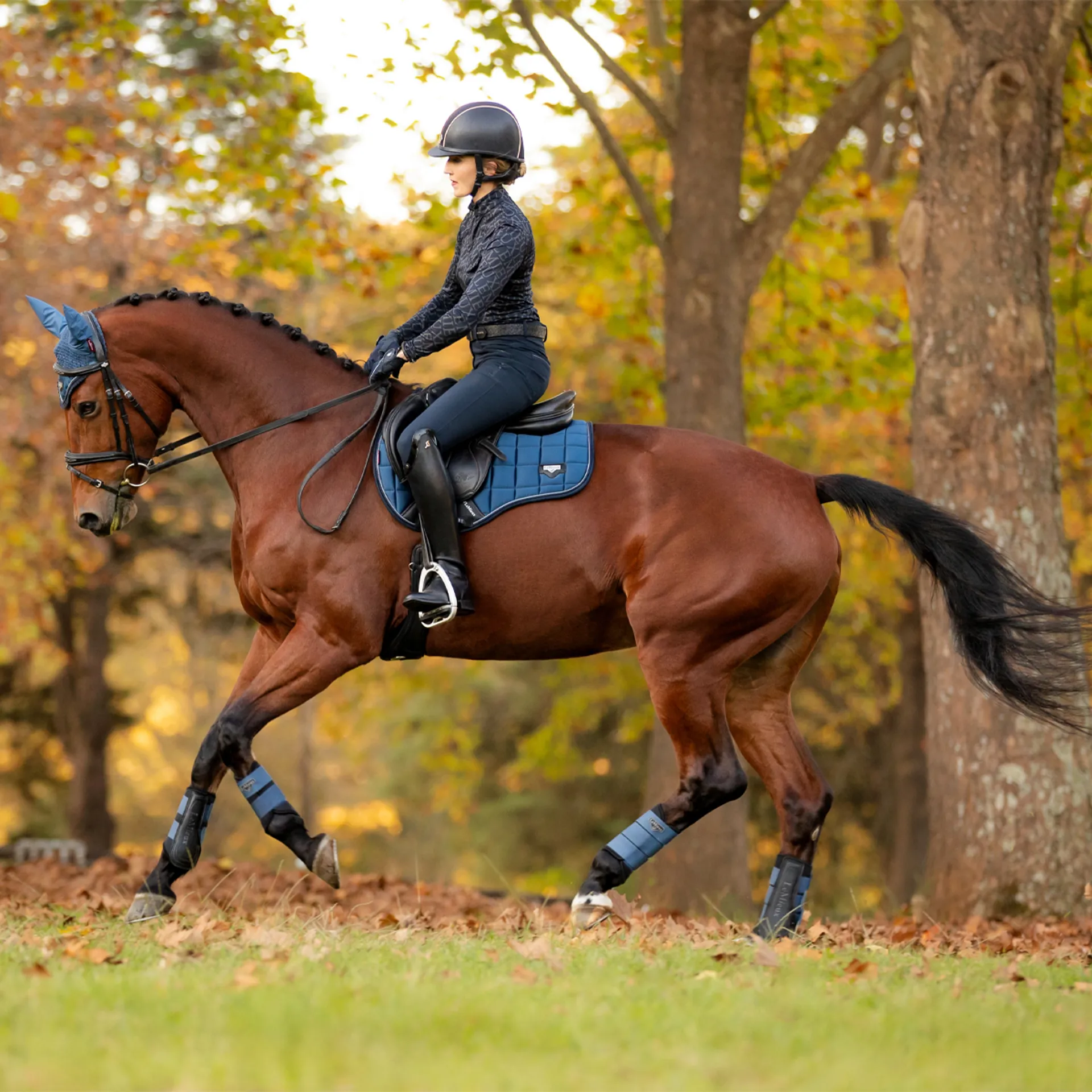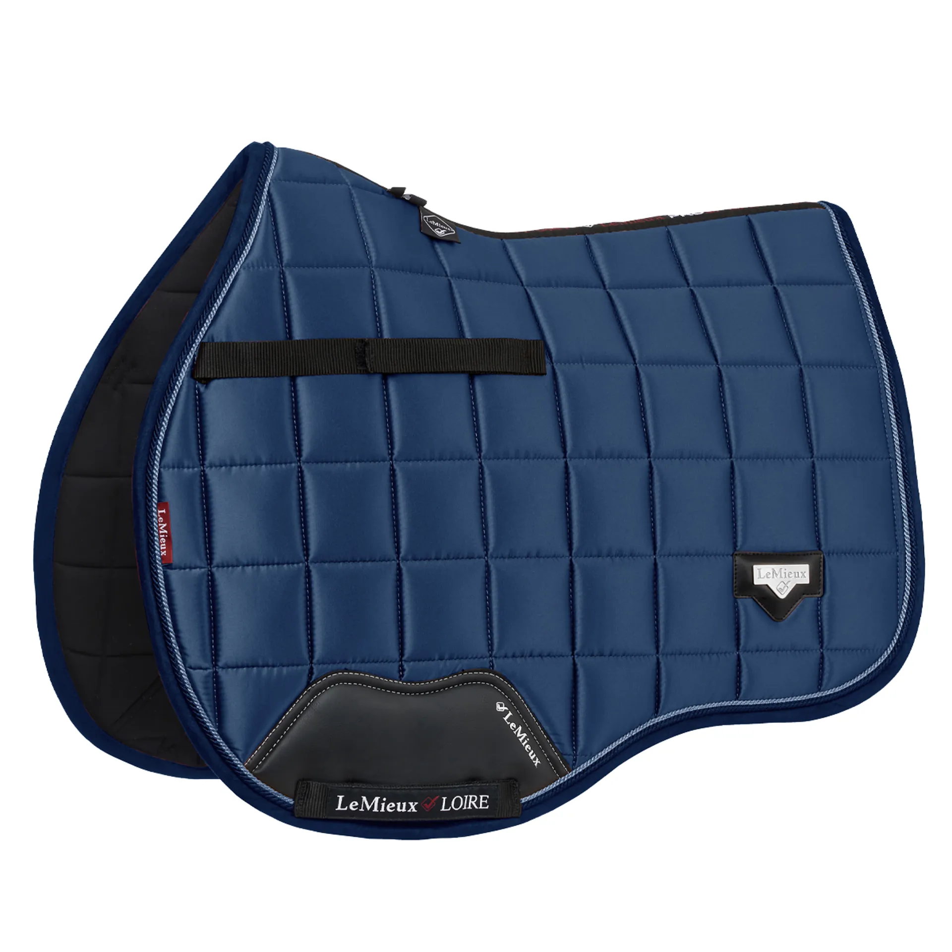 The textured pu leather girth protection area is complimented by an embossed logo and carries the usual signature LeMieux lower girth strap with its inner locking loops. The piece de resistance of the Loire GP Square is its unique metal badge on a leather mount in the lower back corner.