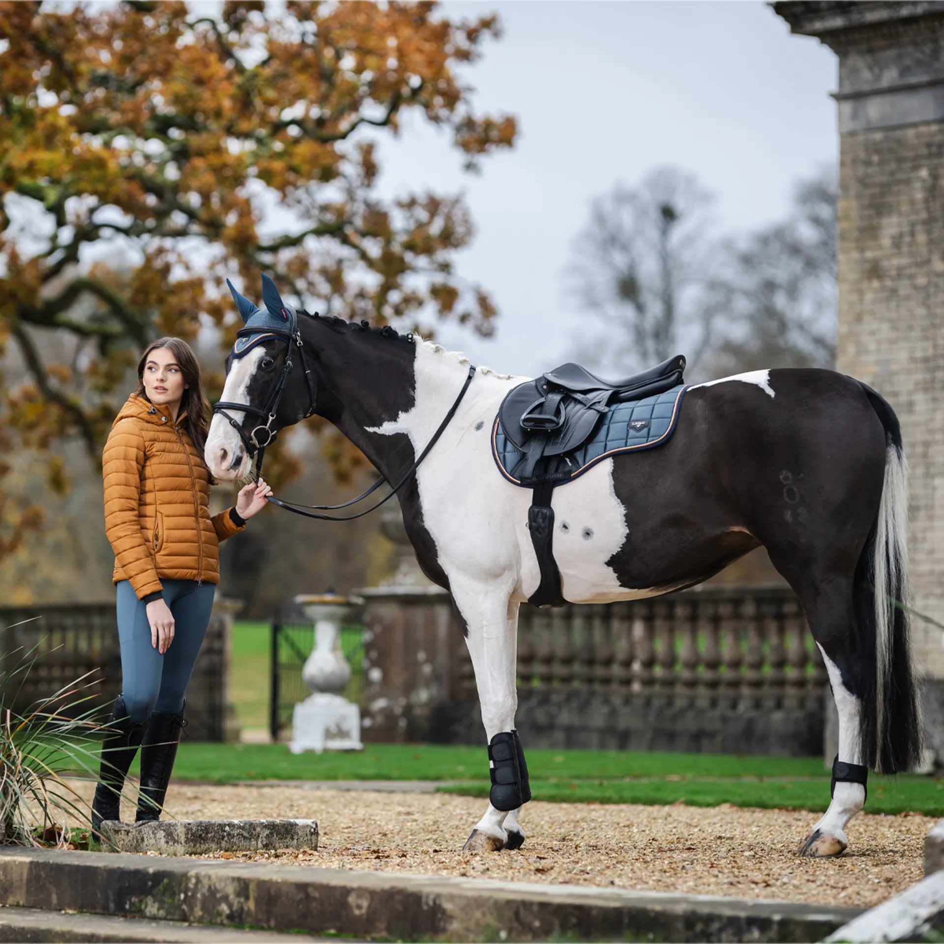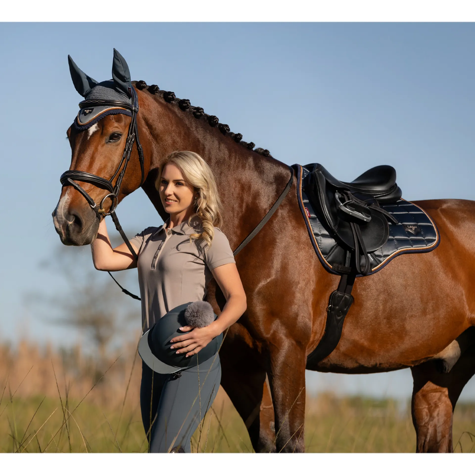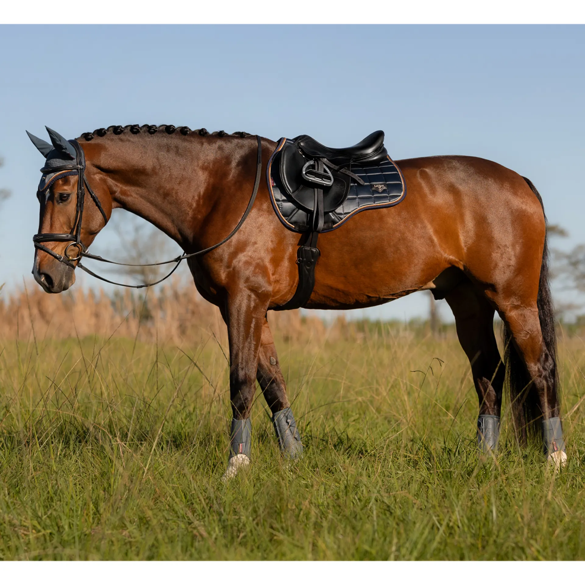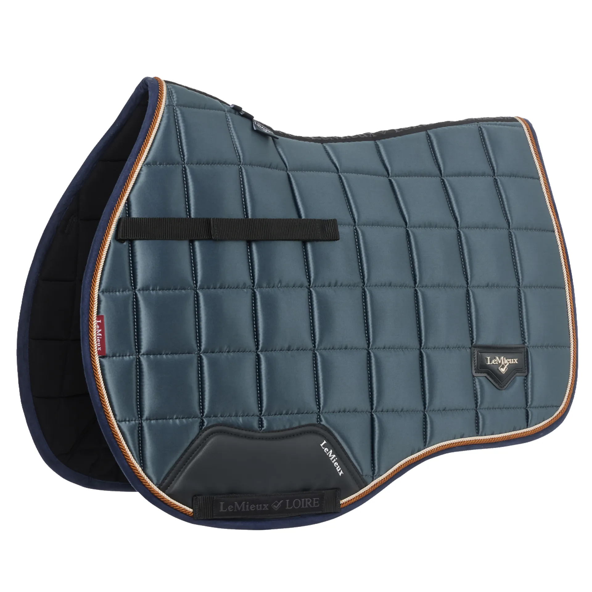 The textured pu leather girth protection area is complimented by an embossed logo and carries the usual signature LeMieux lower girth strap with its inner locking loops. The piece de resistance of the Loire GP Square is its unique metal badge on a leather mount in the lower back corner.