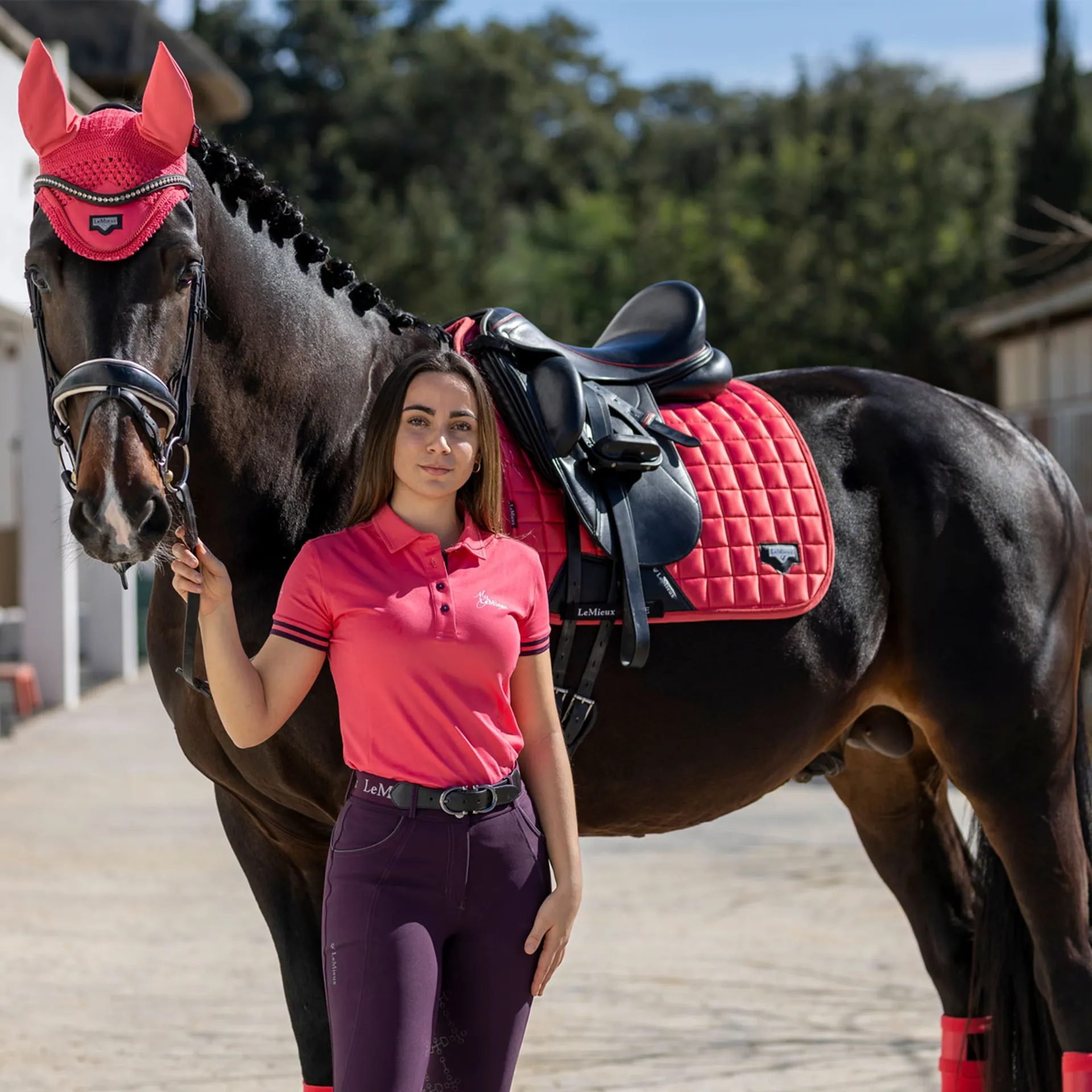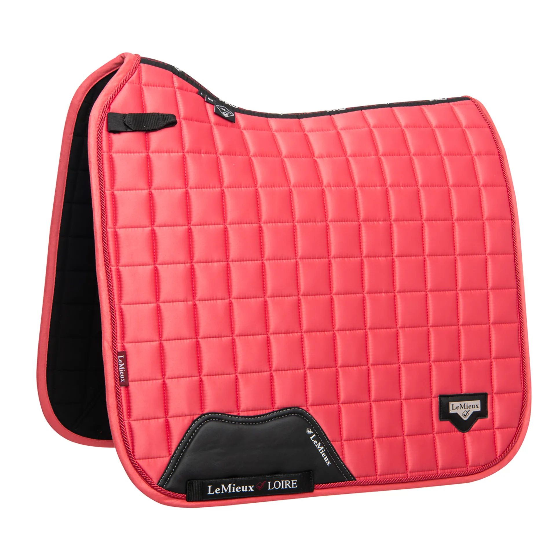 The textured PU leather girth protection area is complimented by an embossed logo and carries the usual signature LeMieux lower girth strap with its inner locking loops. The piece de resistance of the Loire Dressage Square is its unique metal badge on a leather mount in the lower back corner.