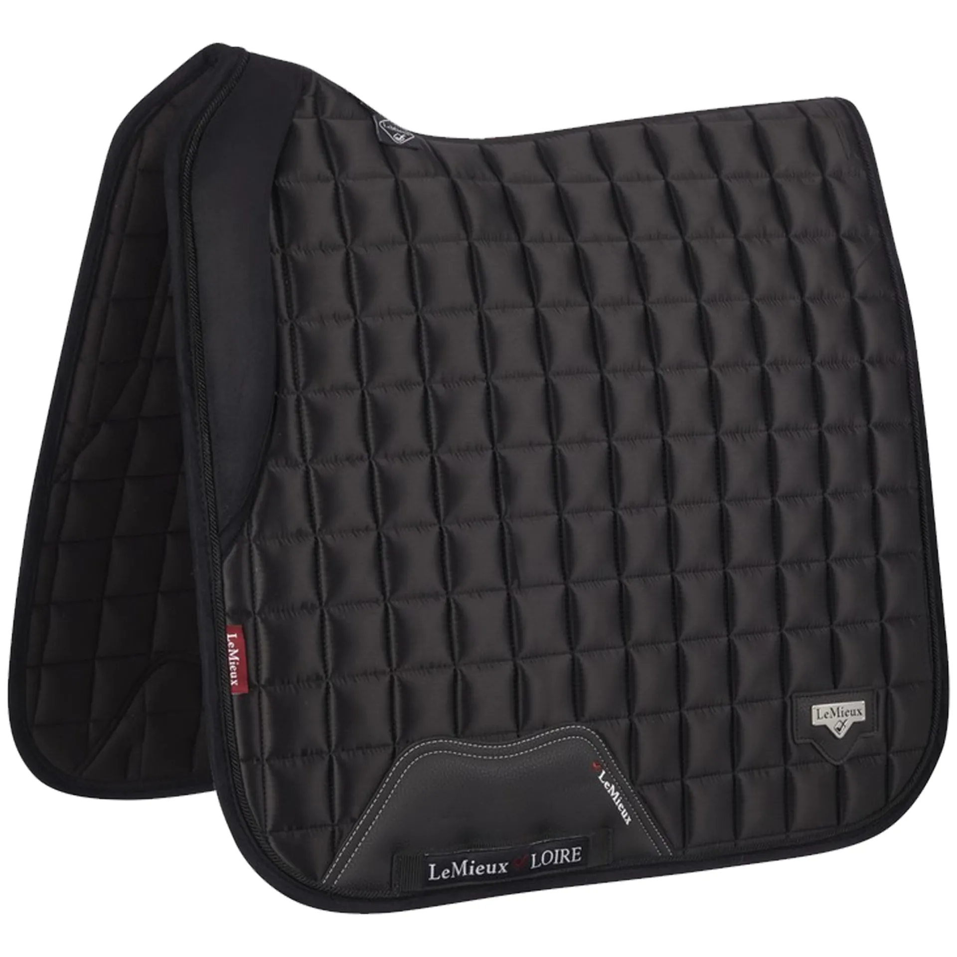 The textured PUleather girth protection area is complimented by an embossed logo and carries the usual signature LeMieux lower girth strap with its inner locking loops. The piece de resistance of the Loire Dressage Square is its unique metal badge on a leather mount in the lower back corner.