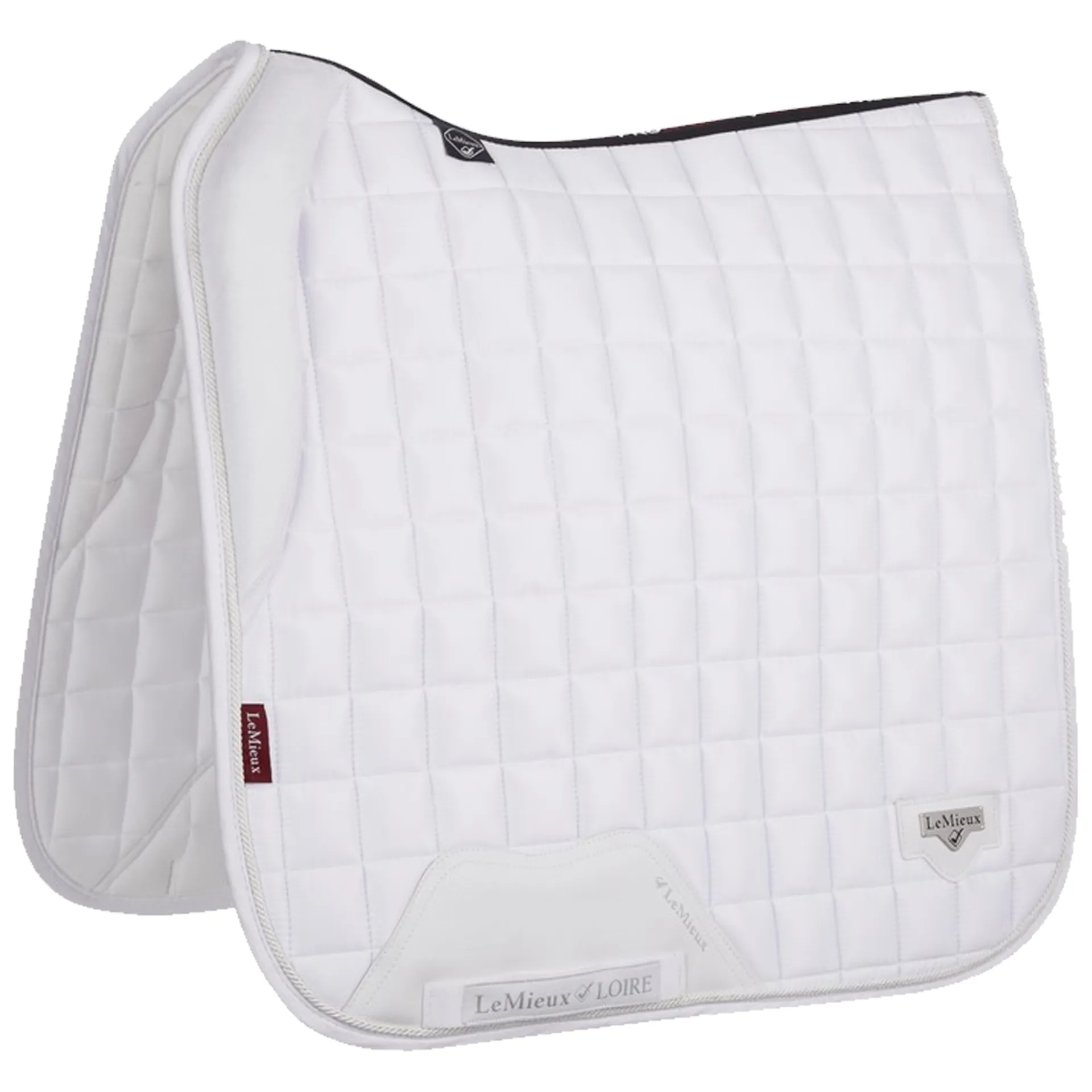 The textured PUleather girth protection area is complimented by an embossed logo and carries the usual signature LeMieux lower girth strap with its inner locking loops. The piece de resistance of the Loire Dressage Square is its unique metal badge on a leather mount in the lower back corner.