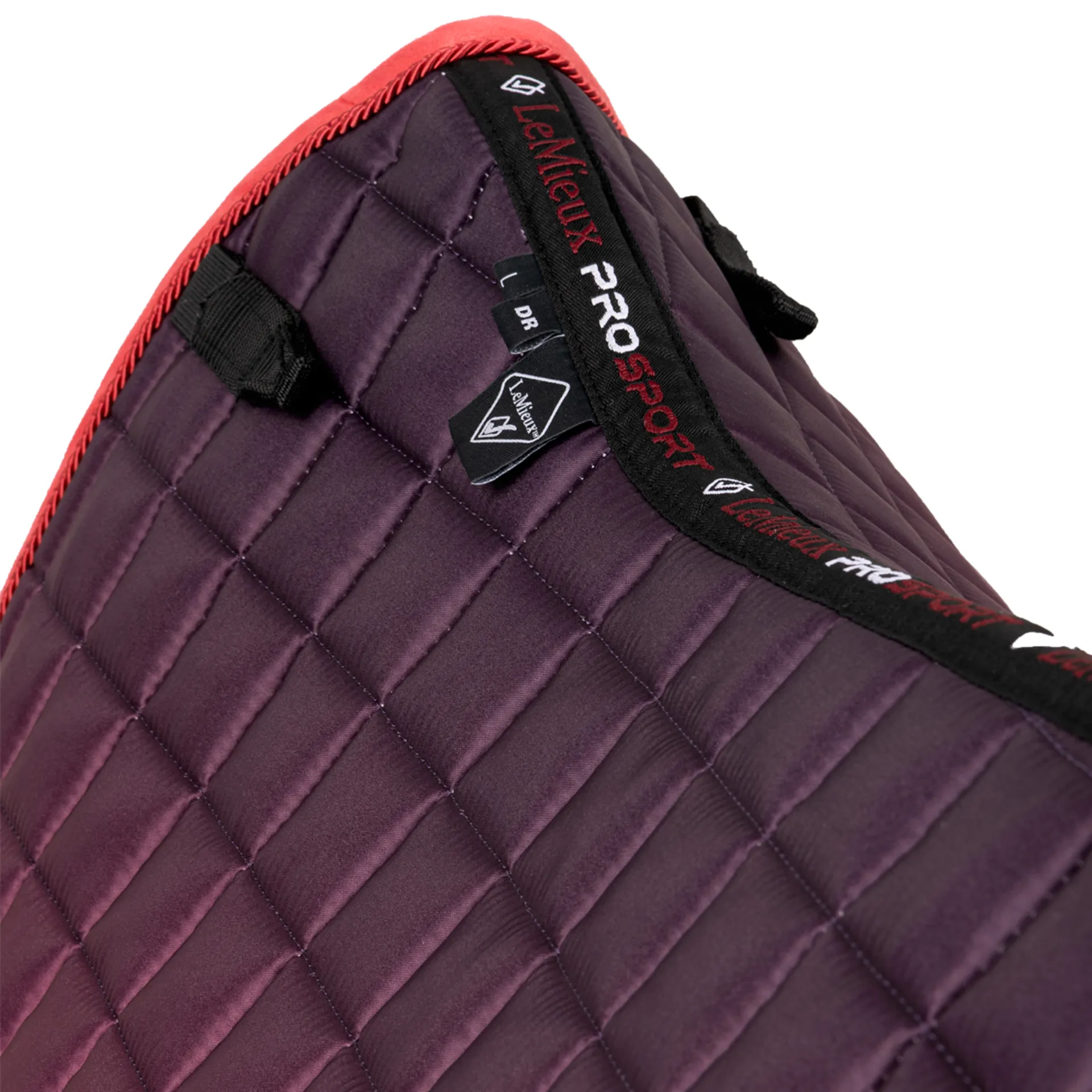 The textured pu leather girth protection area is complimented by an embossed logo and carries the usual signature LeMieux lower girth strap with its inner locking loops, and the D-Ring tabs hold the pad securely to the saddle.
