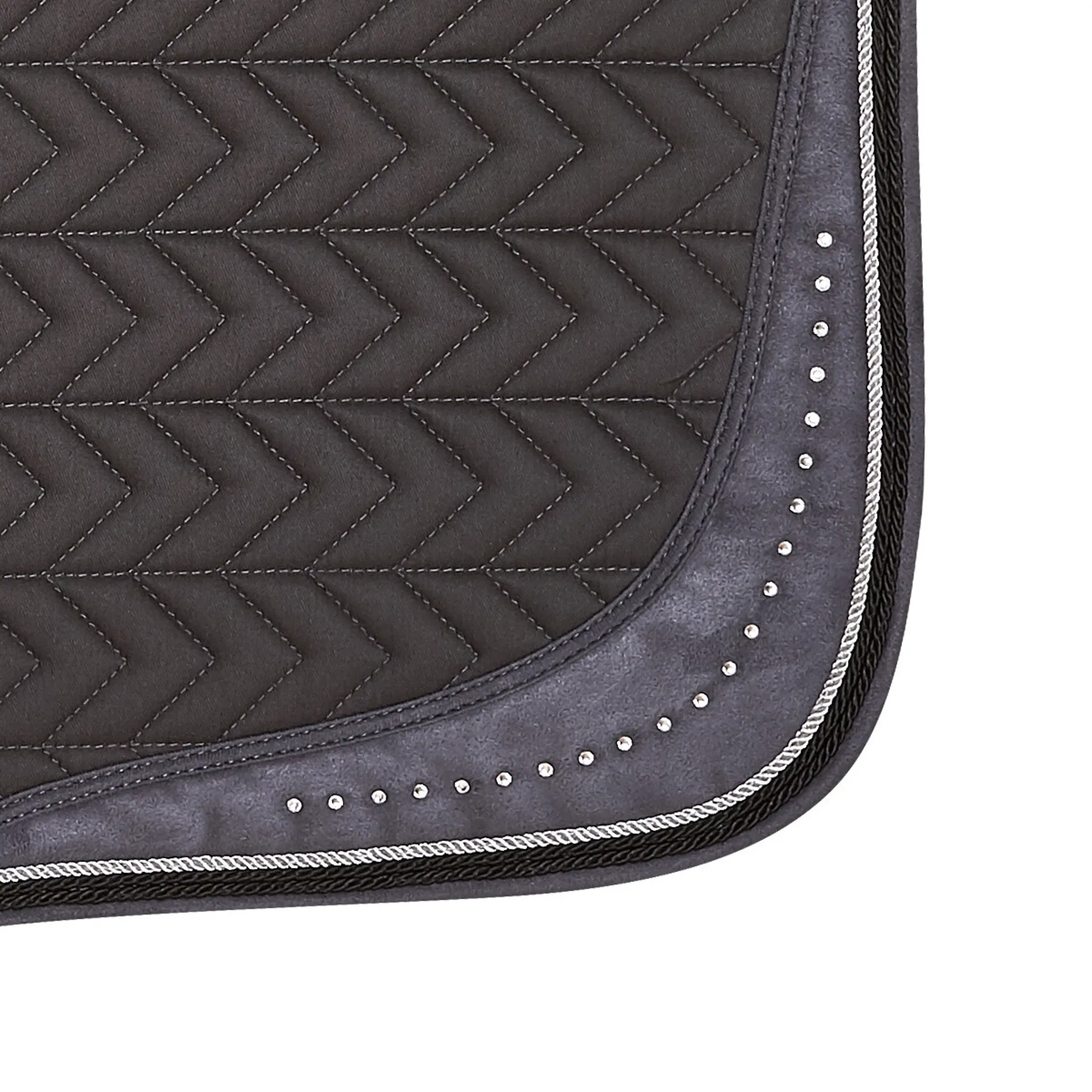 This cotton saddle pad has a quick dry inside for fast wicking. The suede details are especially trendy, as well as the three small cords and the sparkling rhinestones.