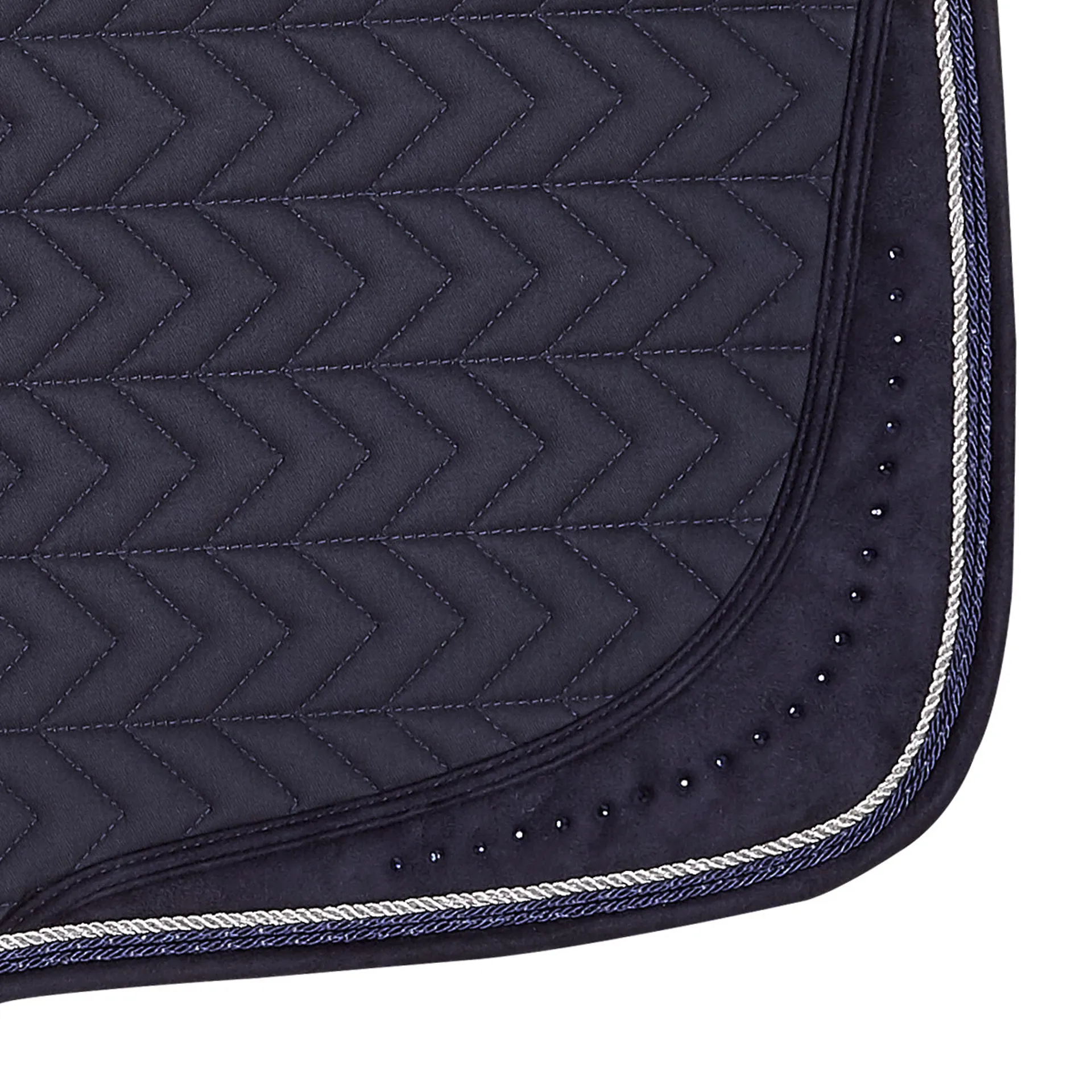 This cotton saddle pad has a quick dry inside for fast wicking. The suede details are especially trendy, as well as the three small cords and the sparkling rhinestones.