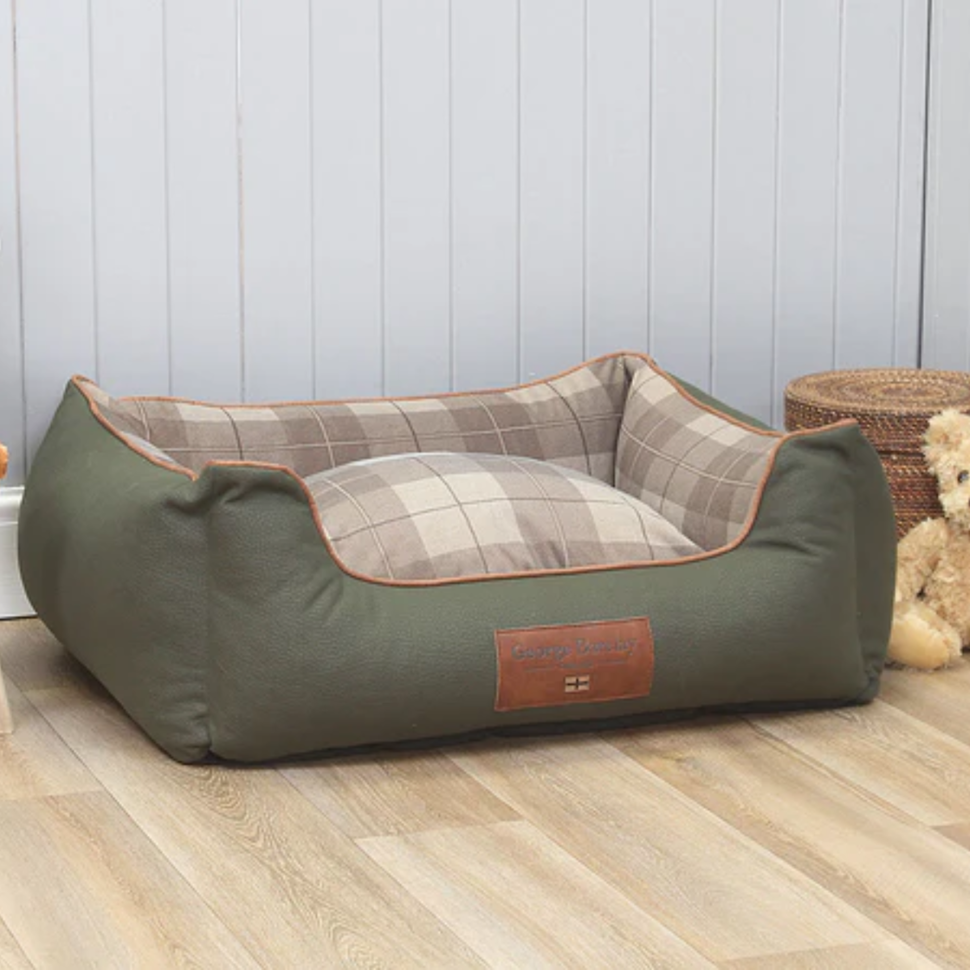The George Barclay Heritage, walled dog bed, is a contemporary styled dog bed, inspired by iconic fashion elements. A soft woven tweed fabriccovers the centre pillow and inner sidewalls, this is paired with contrasting faux leather exterior. The bed is finished with faux suede piping, with an embossed faux leather centre patch, which includes an English flag emblem to complete the beds signature styling.