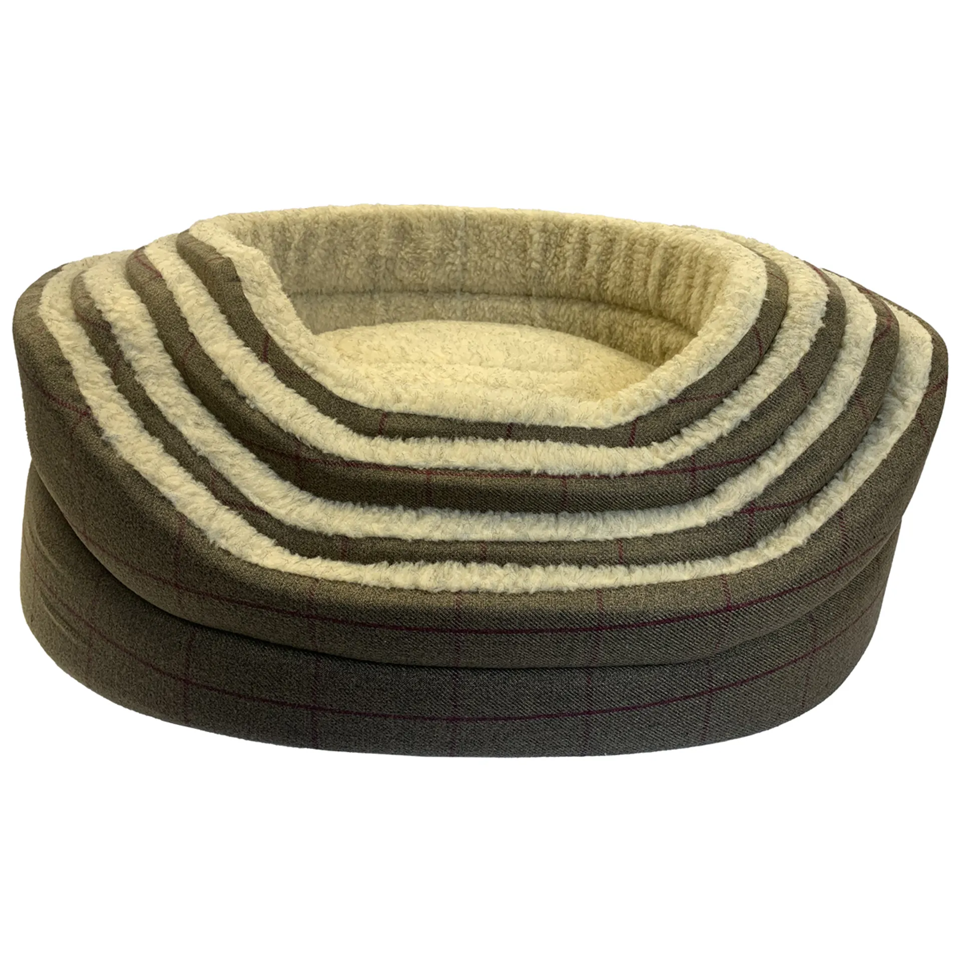 This Hem and Boo oval dog bed comes in a beautiful country chic check design and a contrast fleece lining giving your pet comfort and warmth whilst looking great in any home!High padded foam sides to protect your pet from autumnal chills and a washable padded reversible cushion.Handmade in the U.K.Select from a range of sizes to suit your dog.Medium - Internal 21" x 18" / 53 x 45cm; External 24" x 21" / 61 x 53cmLarge - Internal 24" x 21" / 61 x 53cm; External 27" x 24" / 68 x 61cmX Large - Internal 27" x 23" / 68 x 58cm; External 32" x 26" / 81 x 66cmXX Large - Internal 33" x 27" / 84 x 68cm; External 36" x 30" / 91 x 76cm