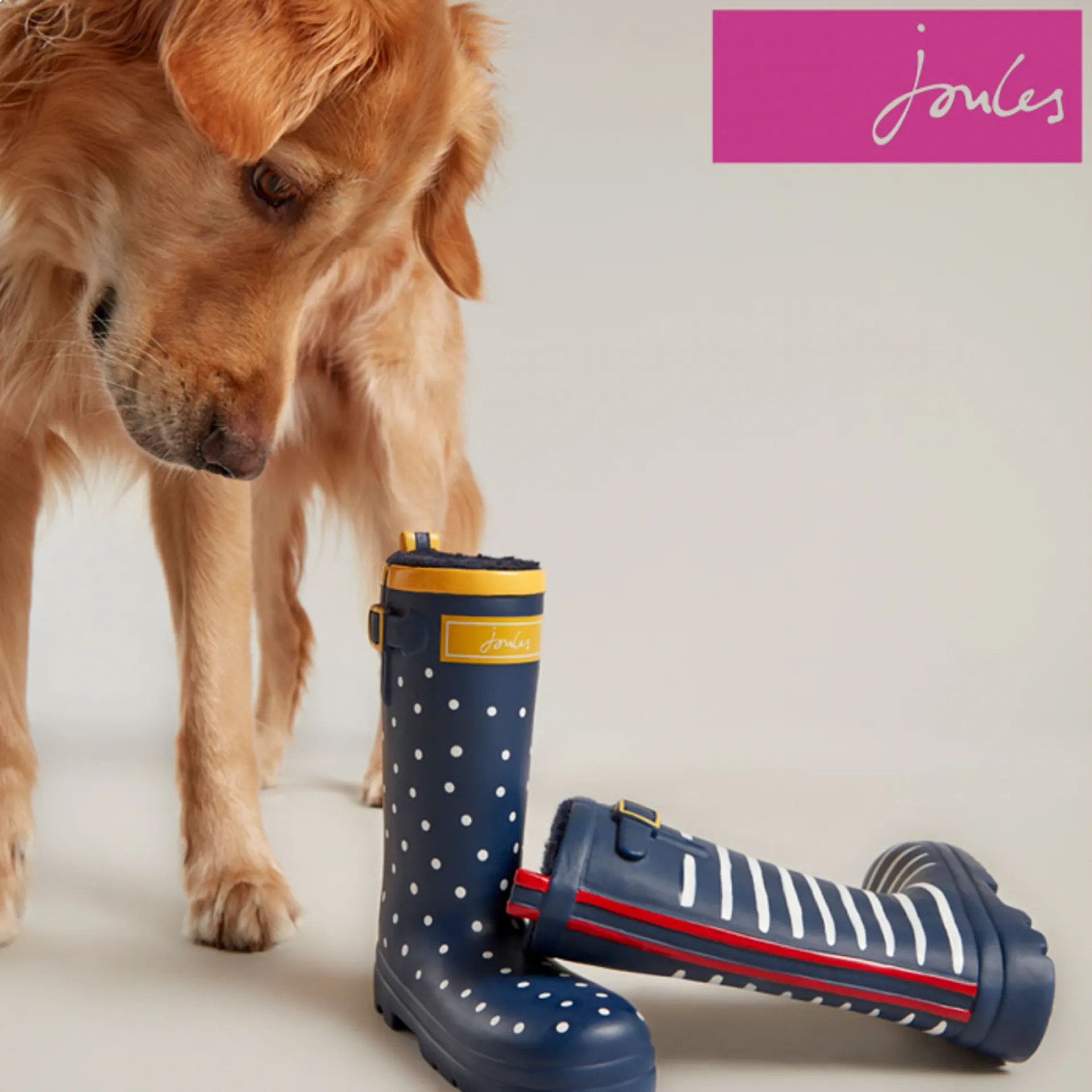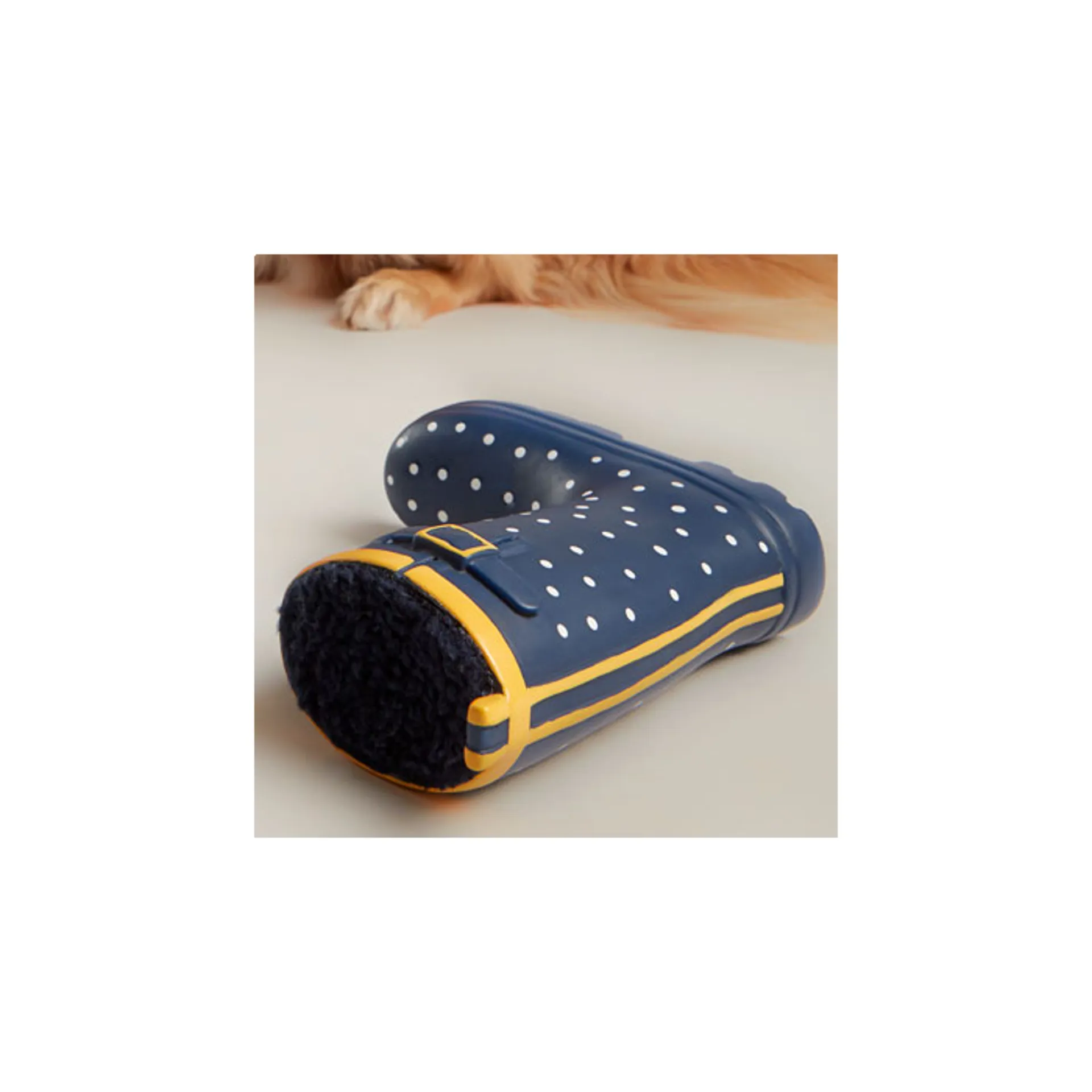 Classic, printed Joules wellington boot which Includes a hidden squeaker, available in two designs. Not suitable for heavy chewers.