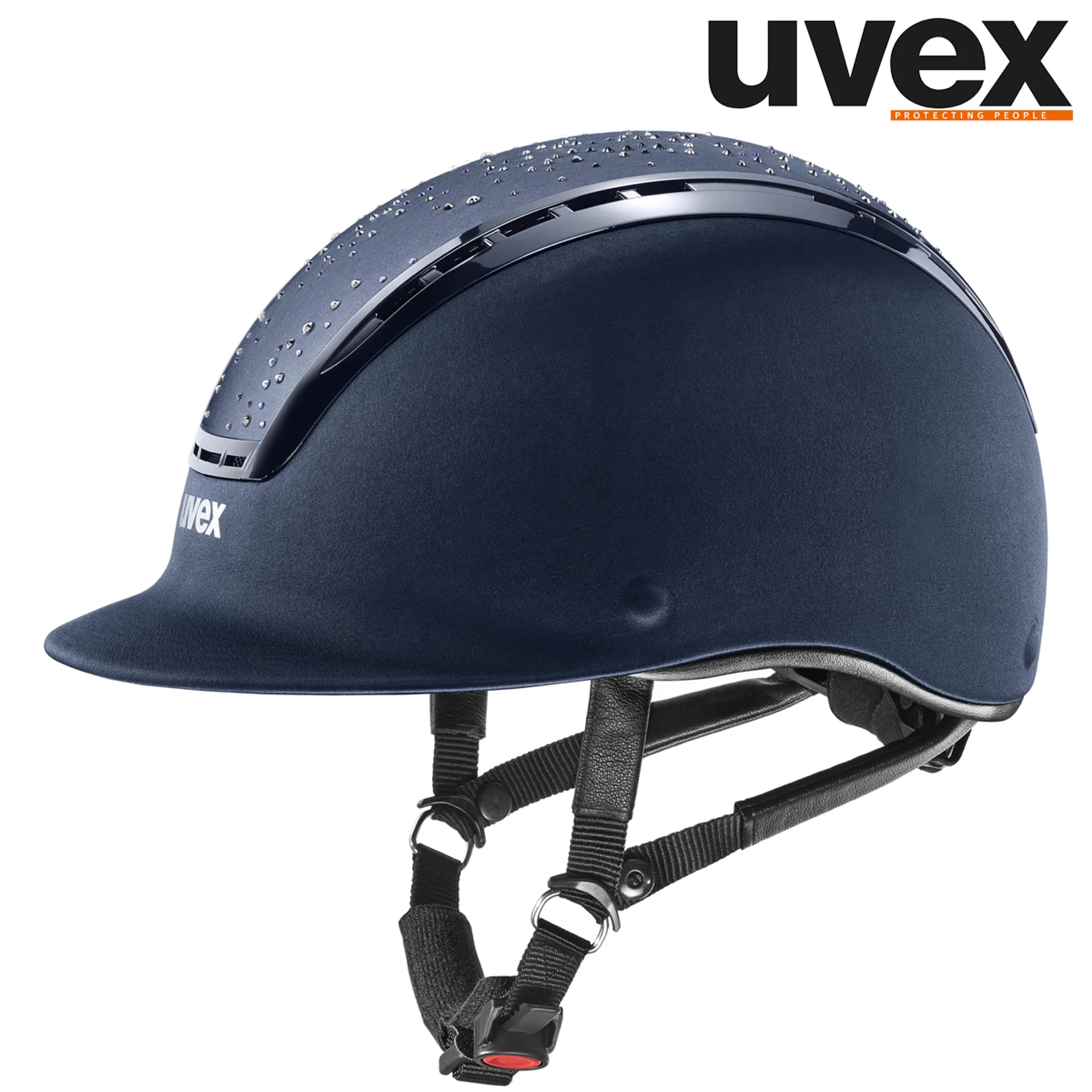 Timeless elegance is the hallmark of the uvex suxxeed diamond. The luxurious glamour version of the classic riding helmet magically attracts admiring glances. Mounted on silky soft satin, Swarovski® crystals sparkle to produce entire spectra of colours. Diamonds reminiscent of a starry sky are perfectly colour-coordinated with the helmet. The premium hard-shell helmet is not only the eye-catcher on every outing but also scores highly with an extremely effective safety combination. The mix of especially robust, impact-resistant outer shell and a shock absorbing EPS inner shell make the uvex suxxeed diamond the first choice for riders with a high need for safety. Rounding off the helmet’s comfort features are its outstanding fit, the breathable liner and excellent ventilation.