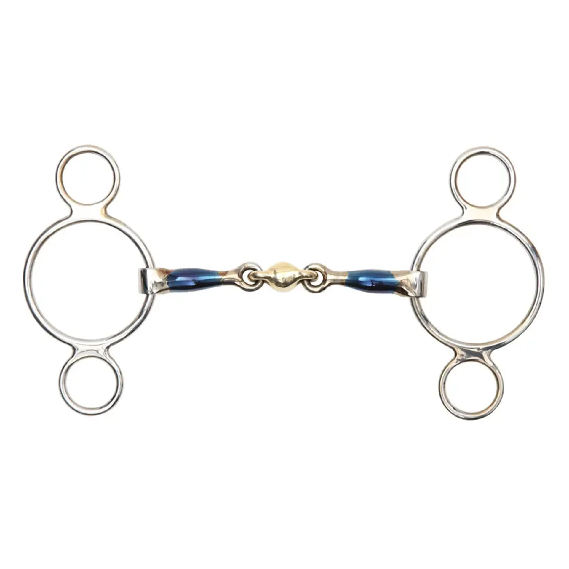 The two ring cheeks allow adaptable poll pressure and leverage on the mouthpiece. The anatomical double joint distributes pressure over both the tongue and bars of the mouth encouraging mouthing and contact. Mouthpiece thickness: 15mm. Cheek height: 125mm (4.5, 5), 145mm (5.5).