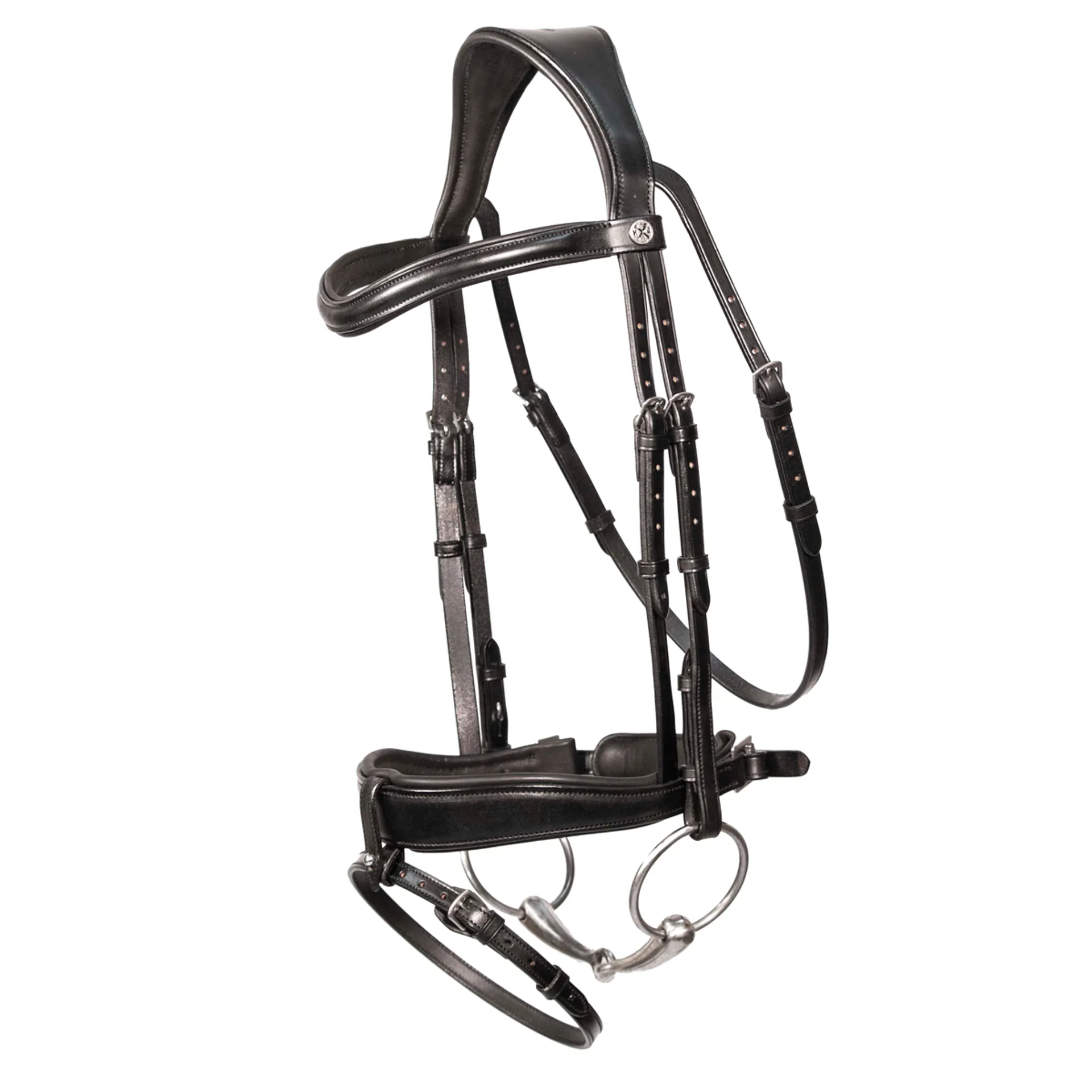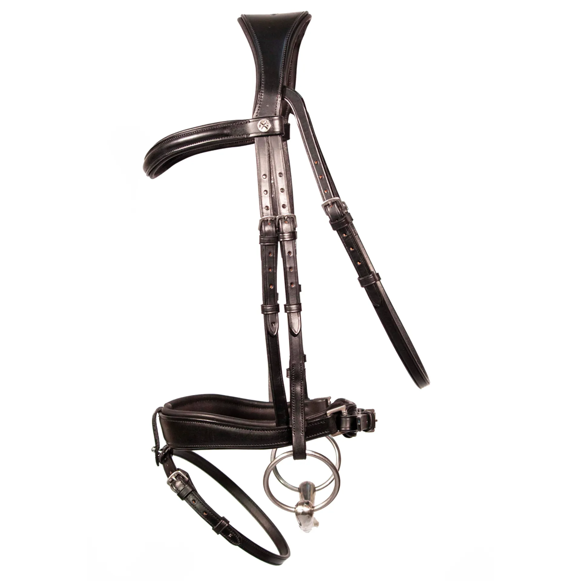 Our unique anatomically shaped crank noseband dips down at the sides to avoid contact with the horse’s cheekbones. A popular choice for dressage bridles, with a completely removable flash attachment, leaving no loop when removed.