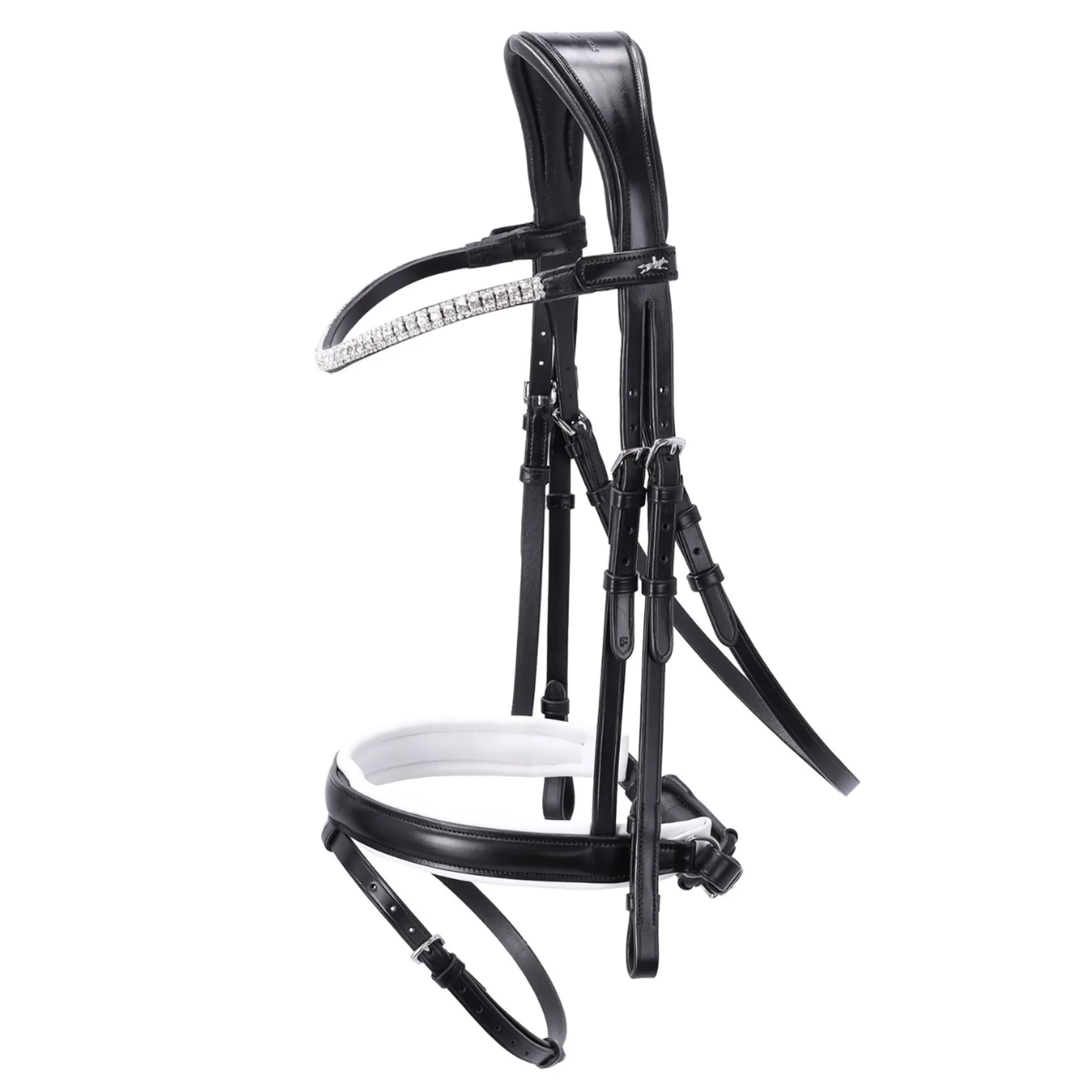The new dressage bridle "Malaga" is the highlight of the revised Classic Line collection. You can purchase the bridle for your horse with either a white or black lined, wide special noseband. The completely removable flash strap with hidden loop and the padded D-rings on the noseband are practical, so nothing is guaranteed to pinch! The new anatomical headpiece is particularly comfortable for your horse. The glittering browband with three rows of crystals is also a special visual highlight. You can easily and conveniently replace it using the press stud with additional Velcro.