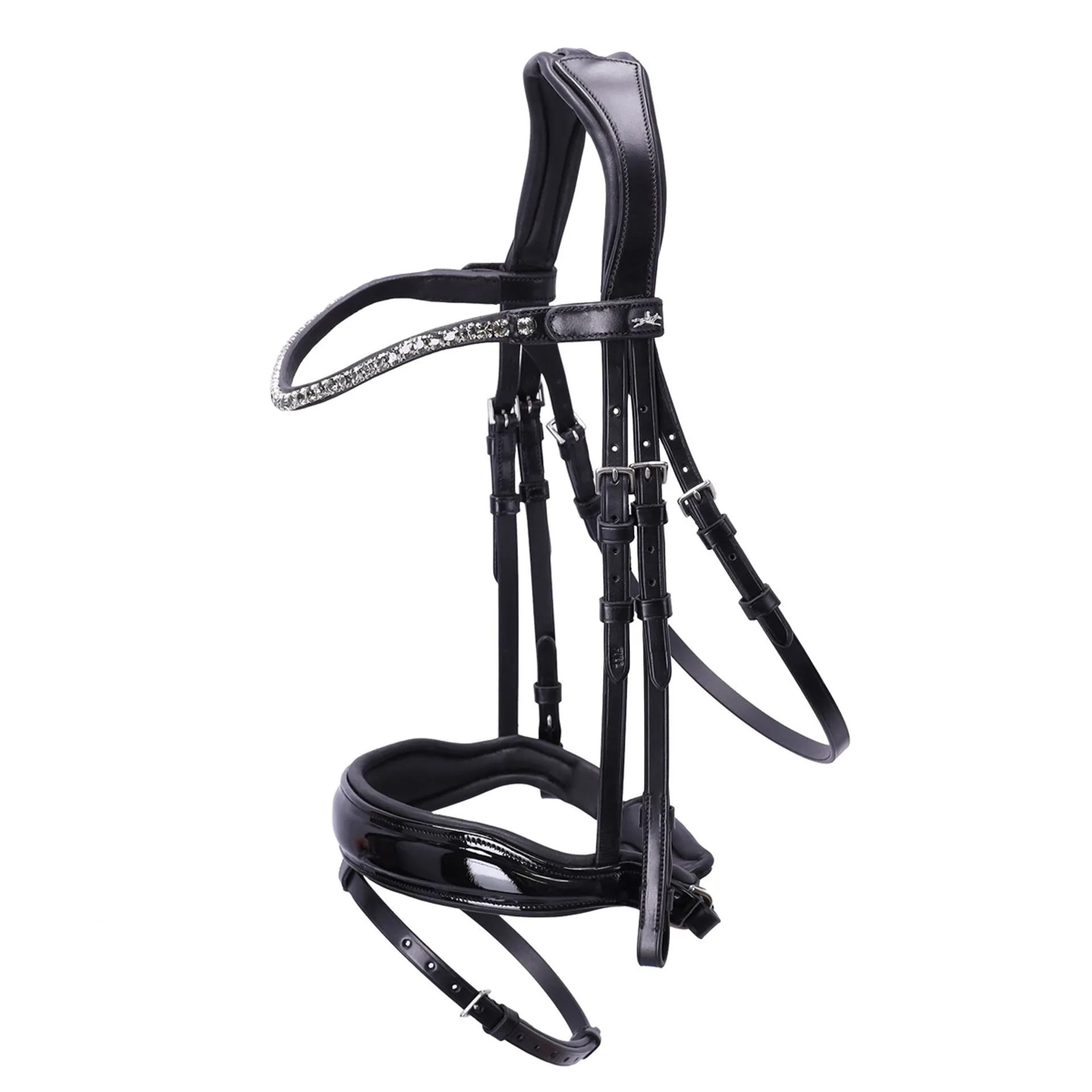 The premium dressage bridle "Siena" made of high-quality, vegetable-tanned leather with its wide, anatomical noseband is not only visually appealing, it also leaves nothing to be desired for your horse in terms of fit: The anatomical headpiece ensures excellent pressure distribution and the softly lined, anatomical special noseband has a cheekbone cut-out and lined D-rings for your horse's comfort. The narrow browband with extra-large crystals can be easily and conveniently replaced using a press stud and an additional Velcro fastener. Like all our bridles, the "Siena" bridle is nickel-free, so you and your horse can concentrate fully on your training.
