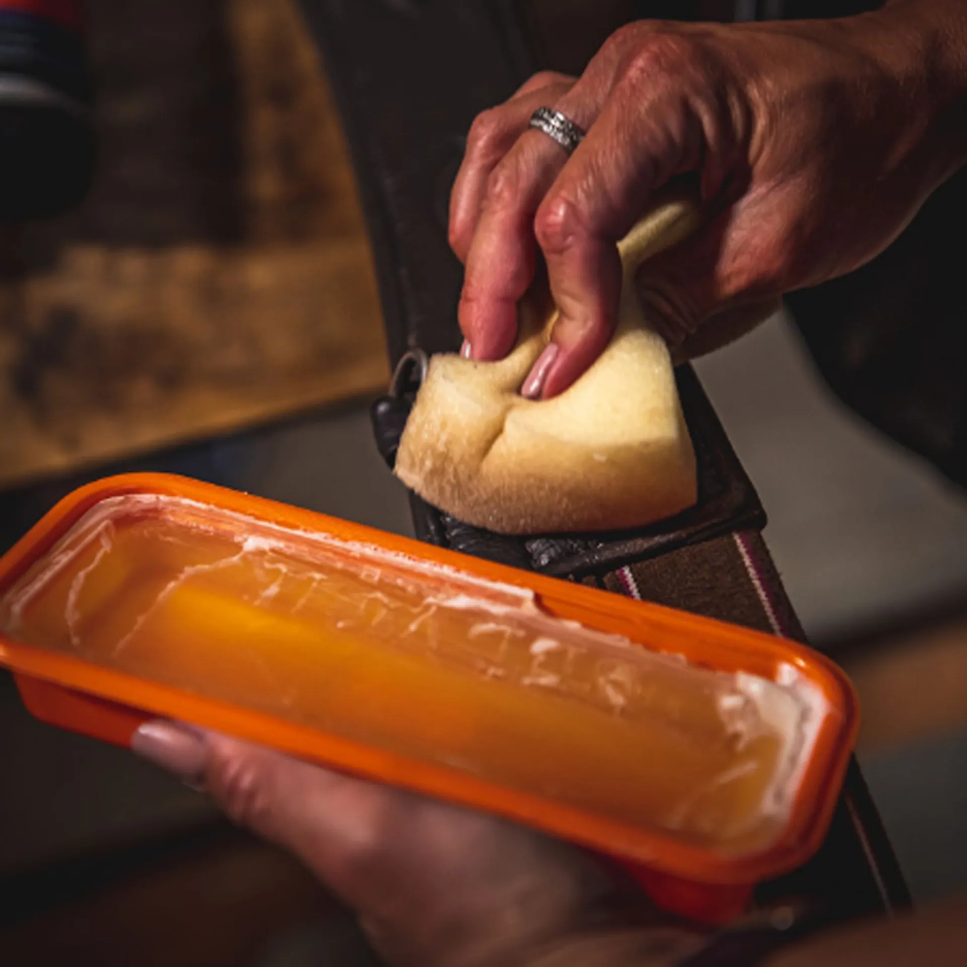 • Apply to clean leather and gently rub in with a cloth or sponge. When dry, polish using a soft, dry cloth.