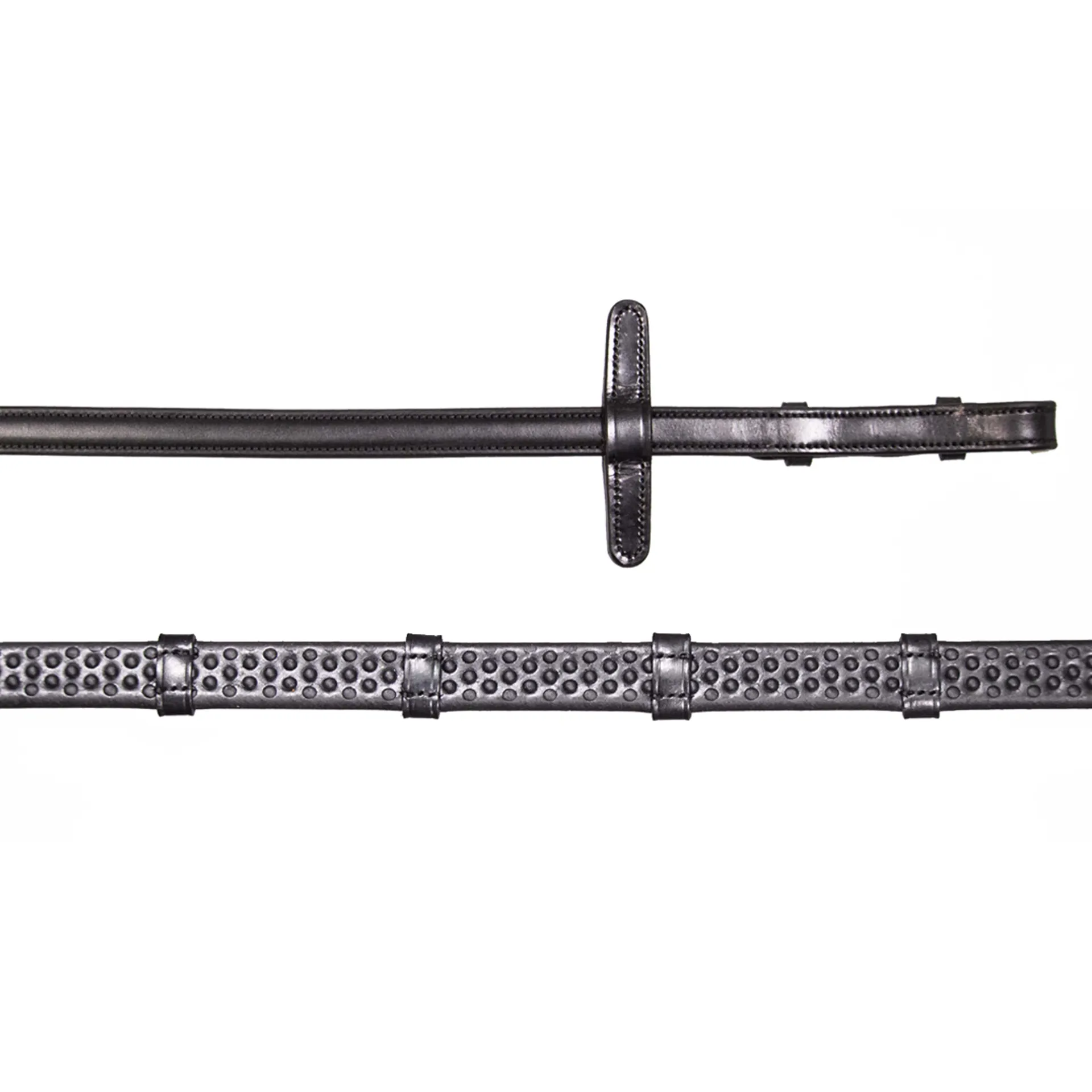 These reins feature Biothane® rubber pimples with hand stitched leather stoppers every 5cm. A very thin and flexible rein more suited for dressage and flatwork.