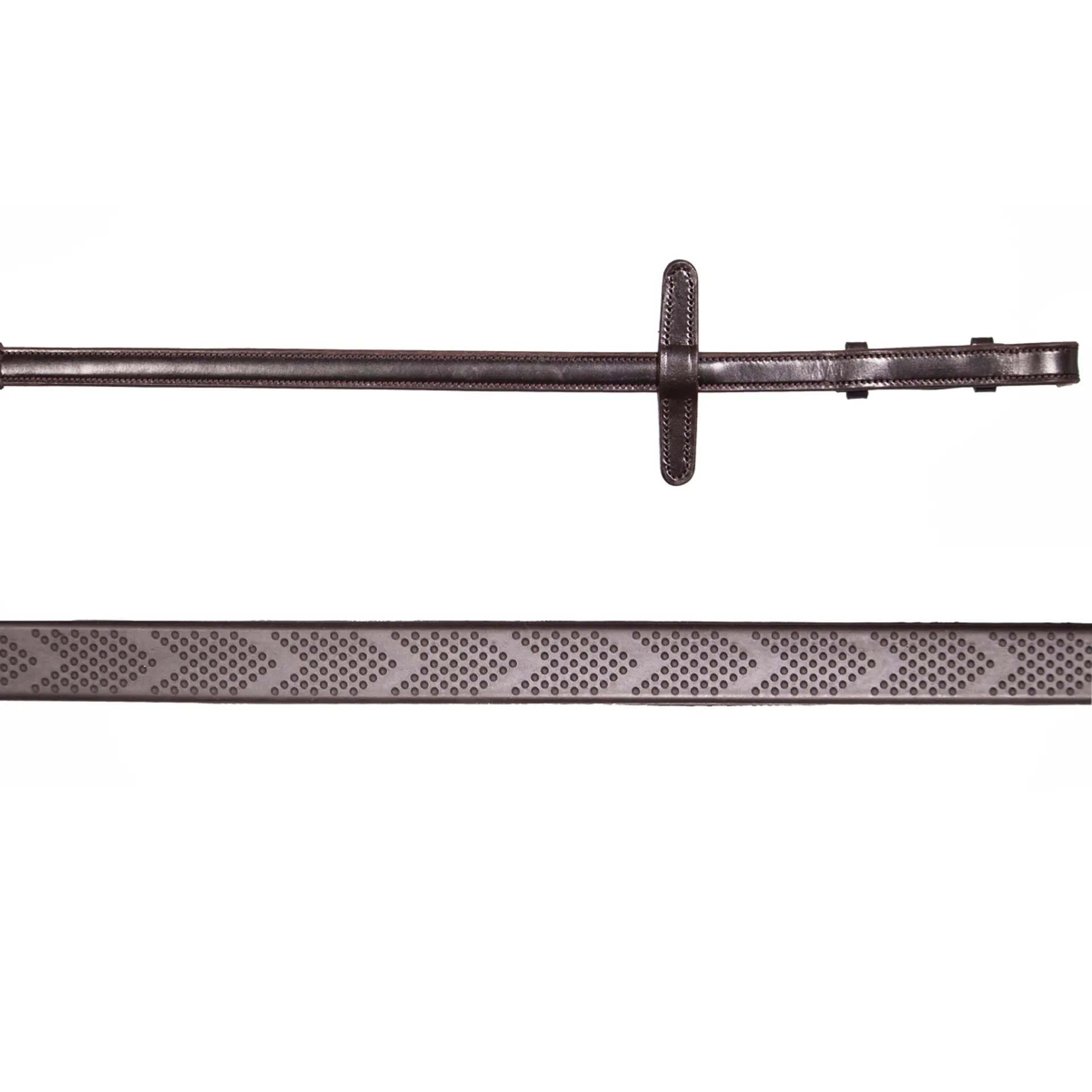 These reins feature small pimples in a chevron formation rubber pimples. A very grippy & soft rein. The small bobbles are rounded on the top making them comfortable to hold with or without gloves.