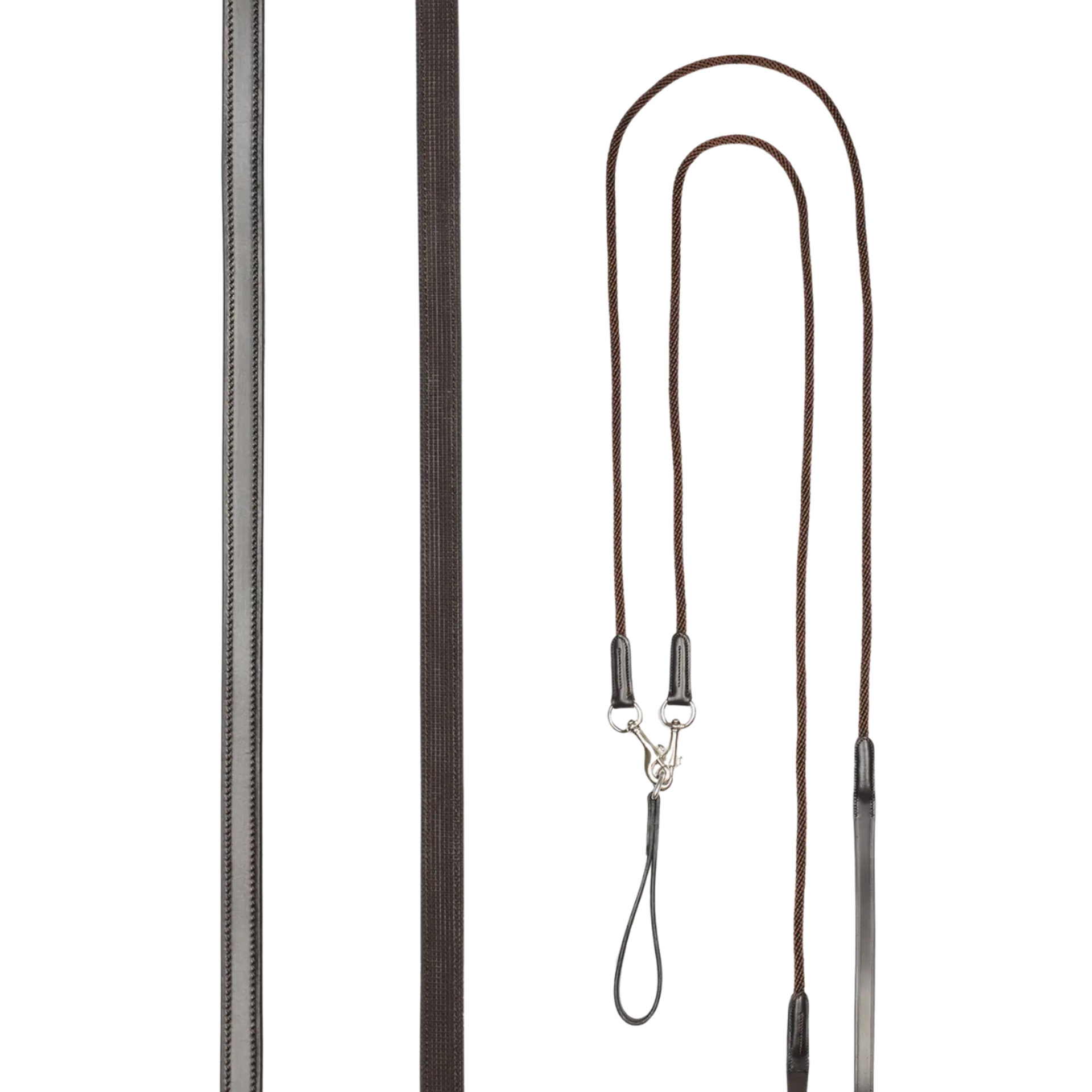 Experienced riders can use draw reins as an aid to gently guide the position of the horse's head during training.These carefully designed reins feature a soft rope section that runs smoothly through the bit. Leather sections with a thin rubber lining sit softly in the hands, allowing for contact to be dropped or maintained at will. Trigger clips attach to the girth D-rings or a provided girth loop.Correct fitting is essential.