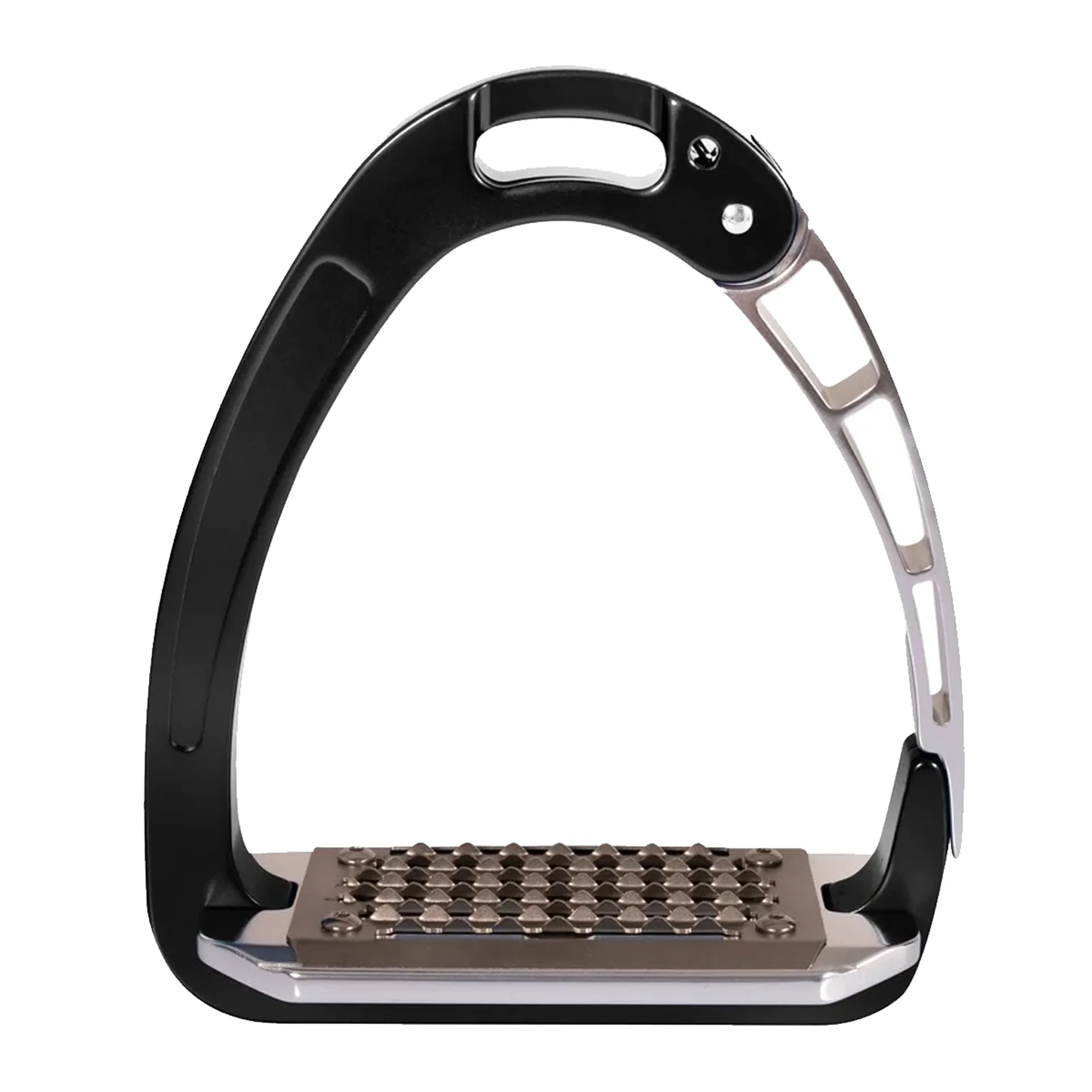 The aluminum, besides giving the stirrup a sleek and elegant appearance, is lightweight and extremely durable, while the stainless steel protects the tread from corrosion, guaranteeing a long life of the product, too. The opening of the stress-actuated locking and release mechanism is located a centimeter higher from the tread to ensure that the foot cannot slip out laterally by mistake and to prevent sand and dirt from delaying the opening action of the arm in case of an emergency.