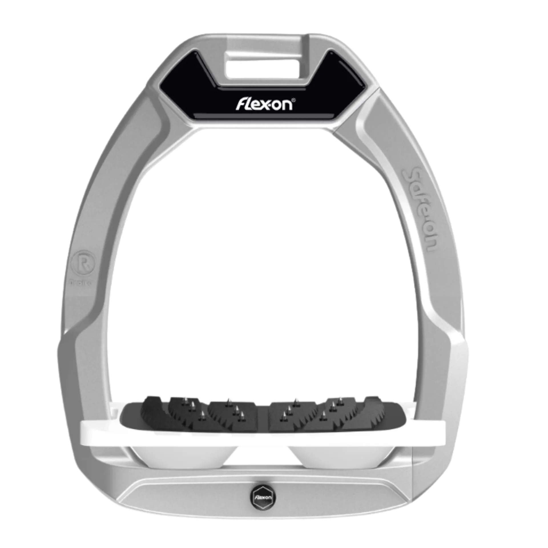 This innovative design is manufactured with a single piece steel core and coated with an organically sourced polyamid material and integrates the shock-absorbing flex-on system to guarantee upper protection of the athlete's body. This structure protects against the risk of breakages. A flexible and retractable arm on the outer side helps to reduce the risk of injury; if you fall from your horse, this arm 'breaks' away to prevent your foot from being stuck in the stirrup. The retractable arm can then be easily screwed back on.