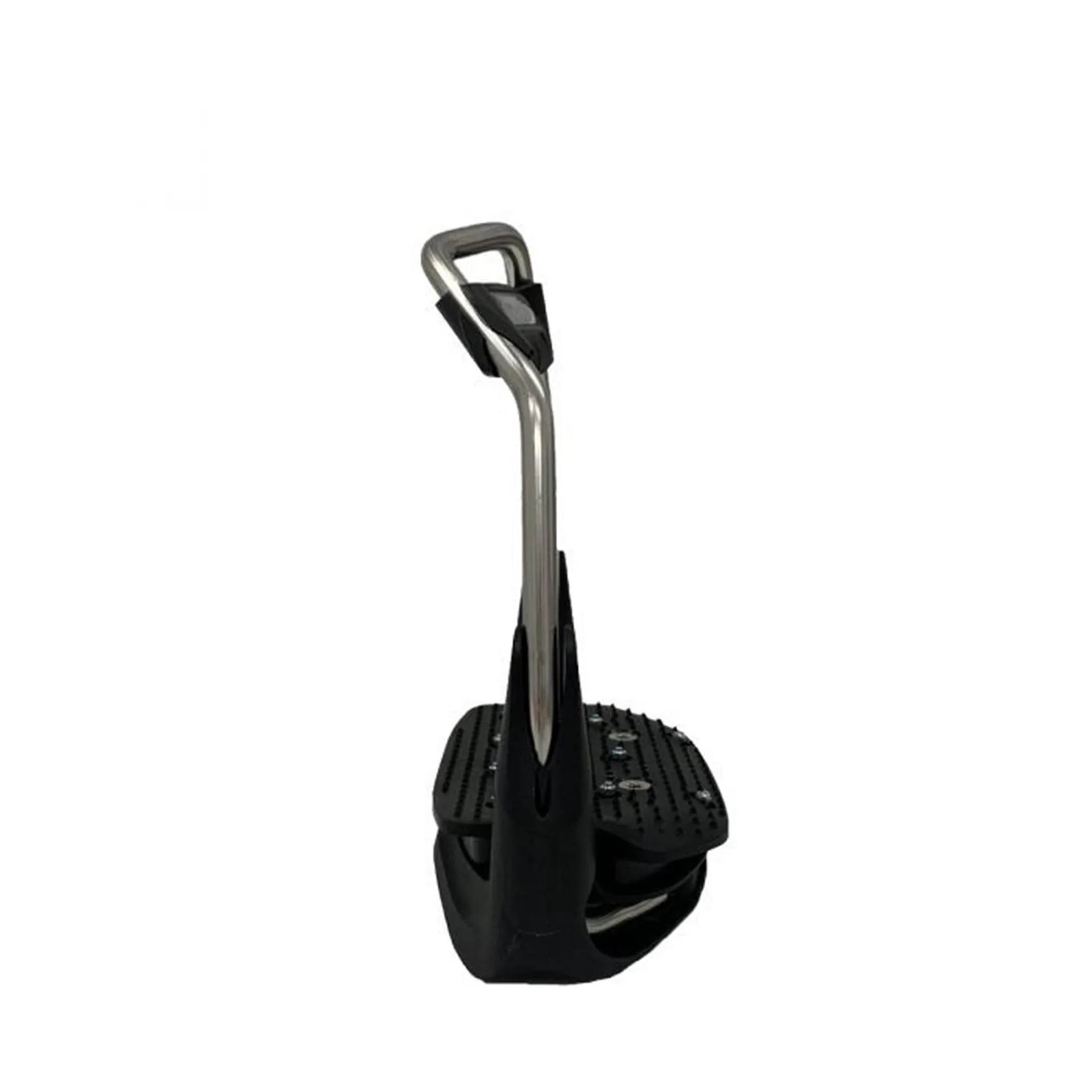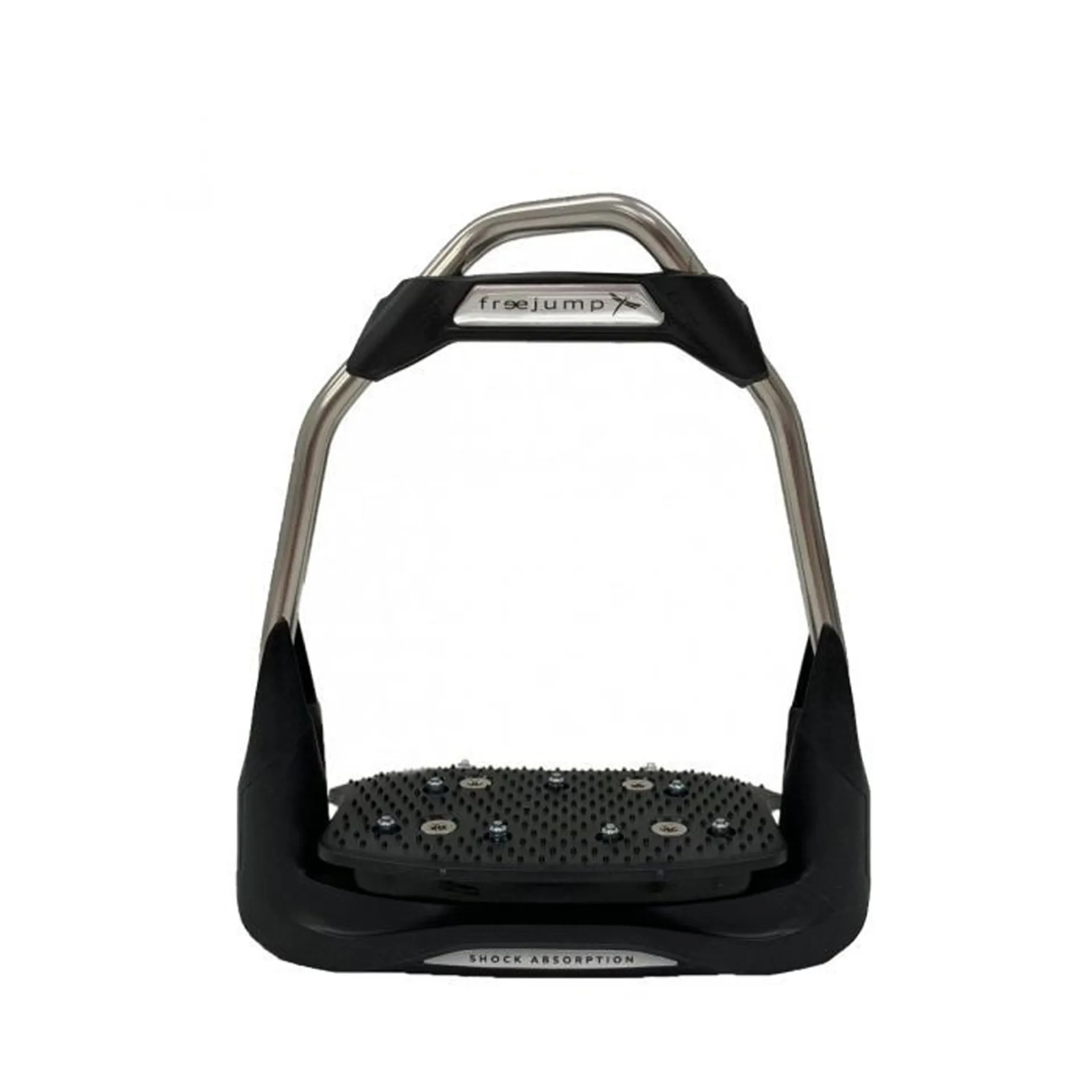 Patented air cushion elastomer sole for shock absorption as well as a 30° oriented eye and a choice between a flat or a 10° inclination on the footbed. Made from Stainless steel, these stirrups have a polyamide headband which is designed to trigger in case of high pressure to help facilitate the release of the foot if necessary.