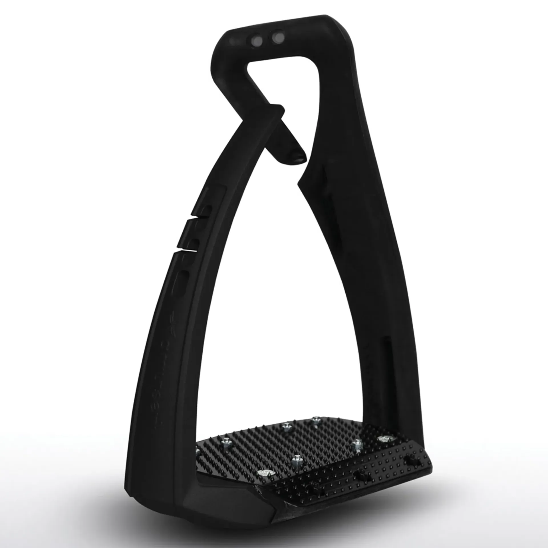 The outer branch of the stirrup is made of Elastollan®, a flexible material that deforms and allows the branch to open, facilitating foot release in case of a fall.