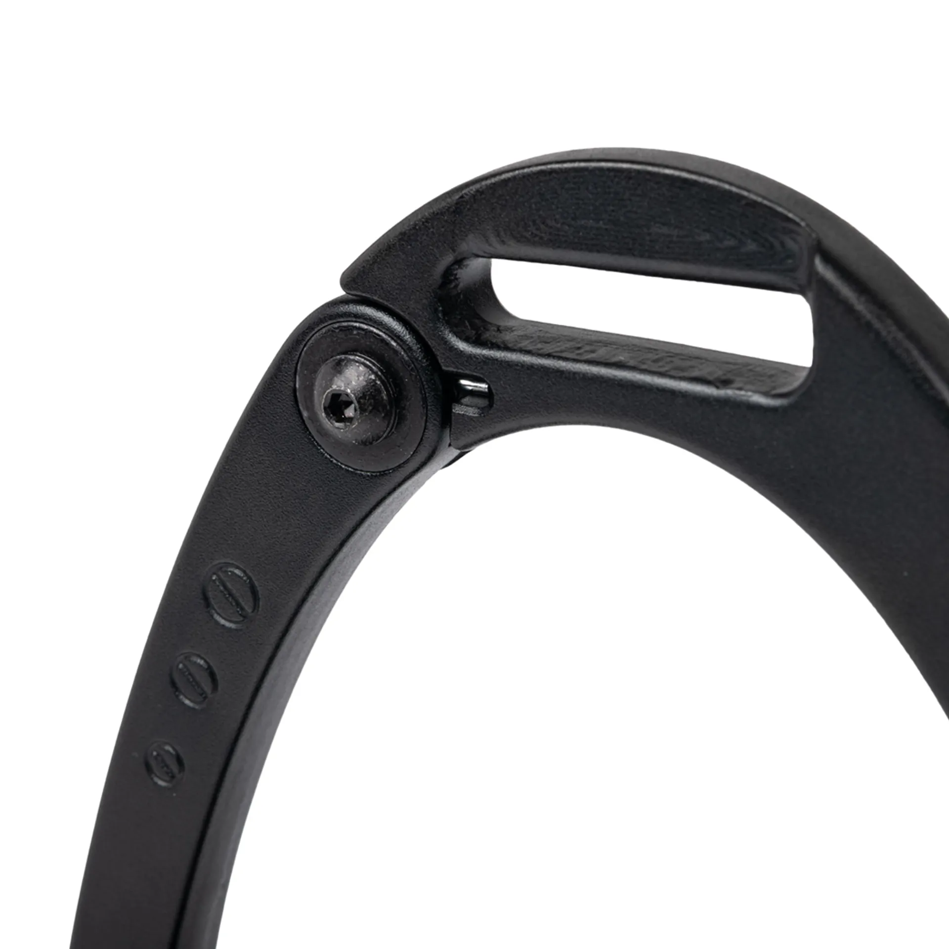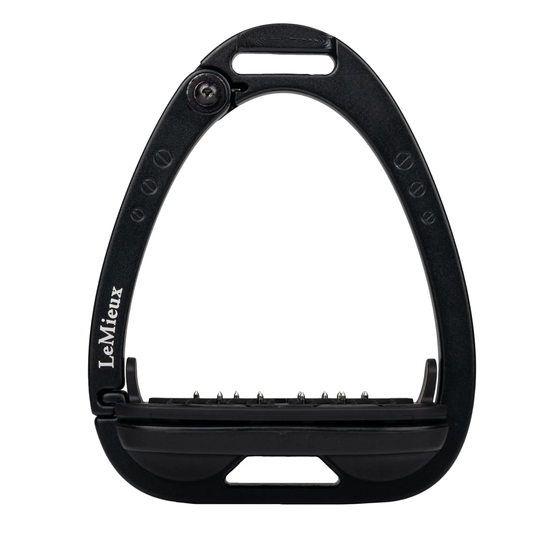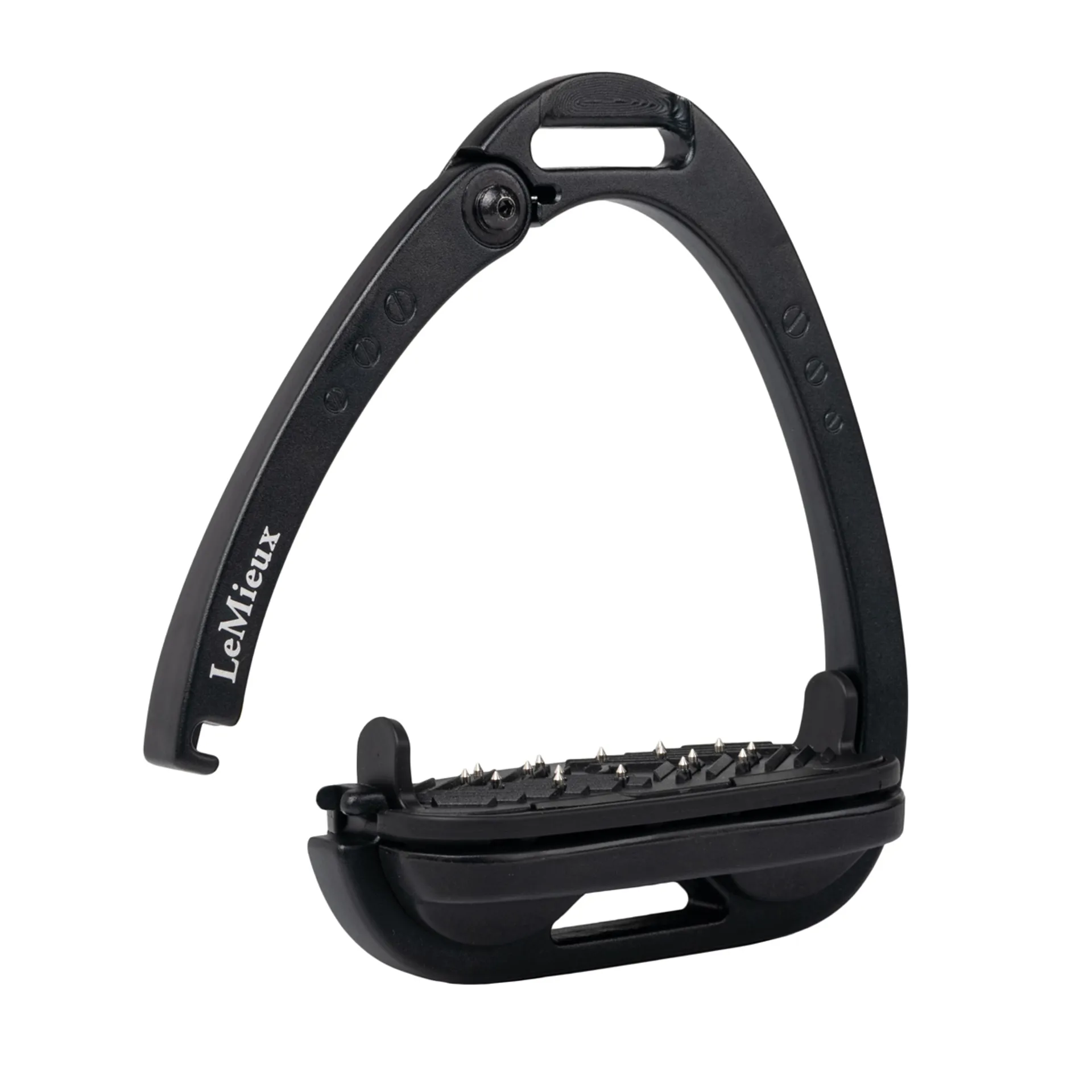 The footplate issupported by a twin balance arch system that distributes the weight evenly across the base of the stirrup frame. The apex of the frame is recessed and off-set, encouraging a 45º outward orientation which makes it easier for the rider to locate the optimum angle for the foot and regain a lost stirrup.