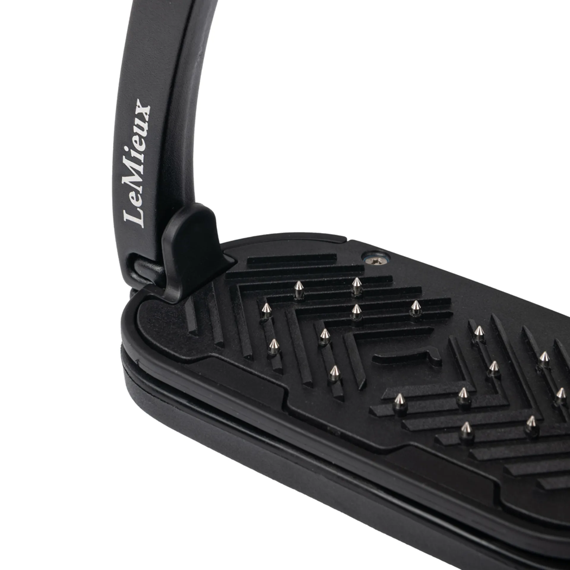 The ergonomic footplate of the Control Stirrup is set at 0º with across-track grip surface withembedded hardened steel pins to provide maximum security of the boot.
