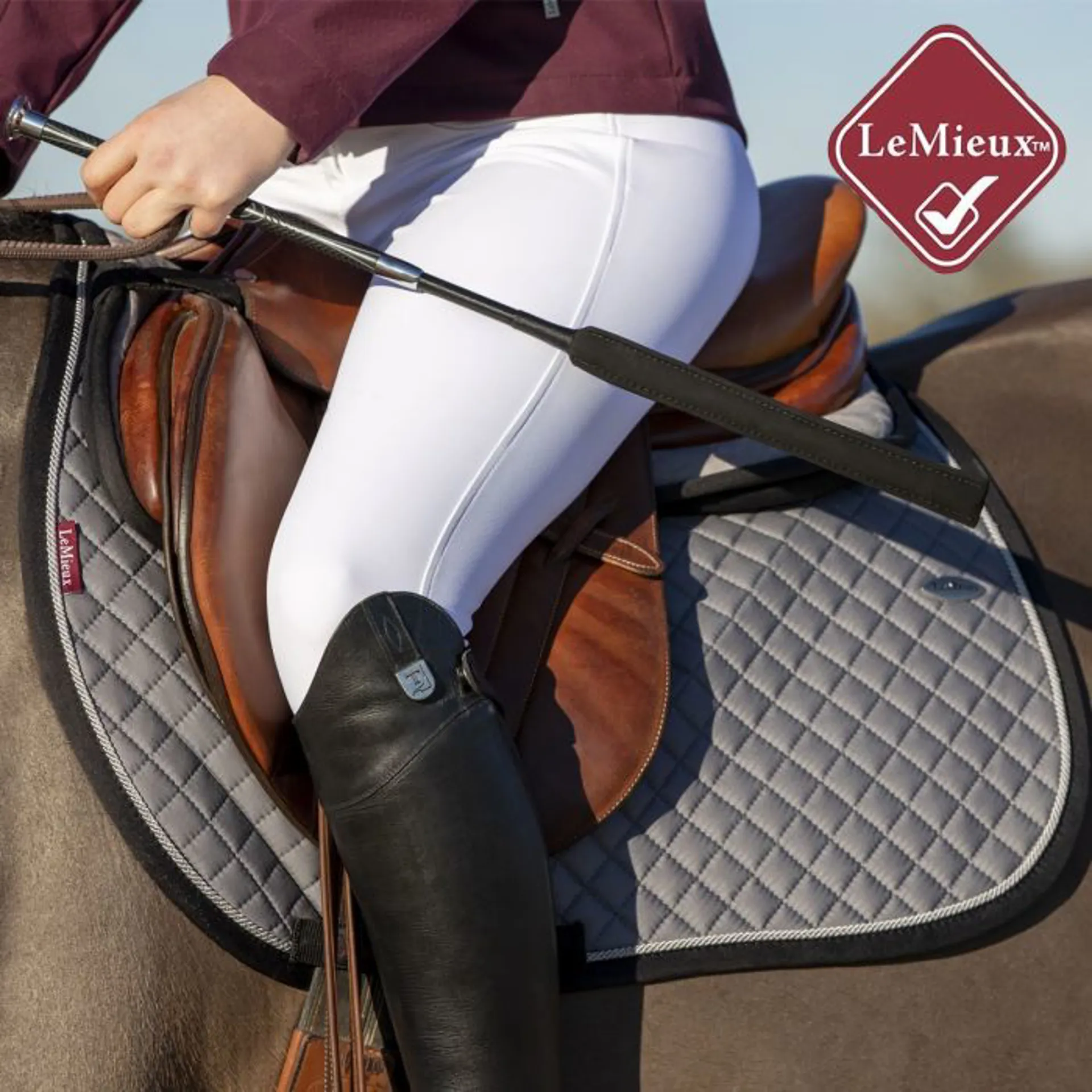 Jumping and general purpose whip with a generous and comfortable grip handle. The kind, shock absorbing gel end pad has a suede covering for a sleek look. The Pro Baton Whip is legal under the new British Showjumping Whip Rule
