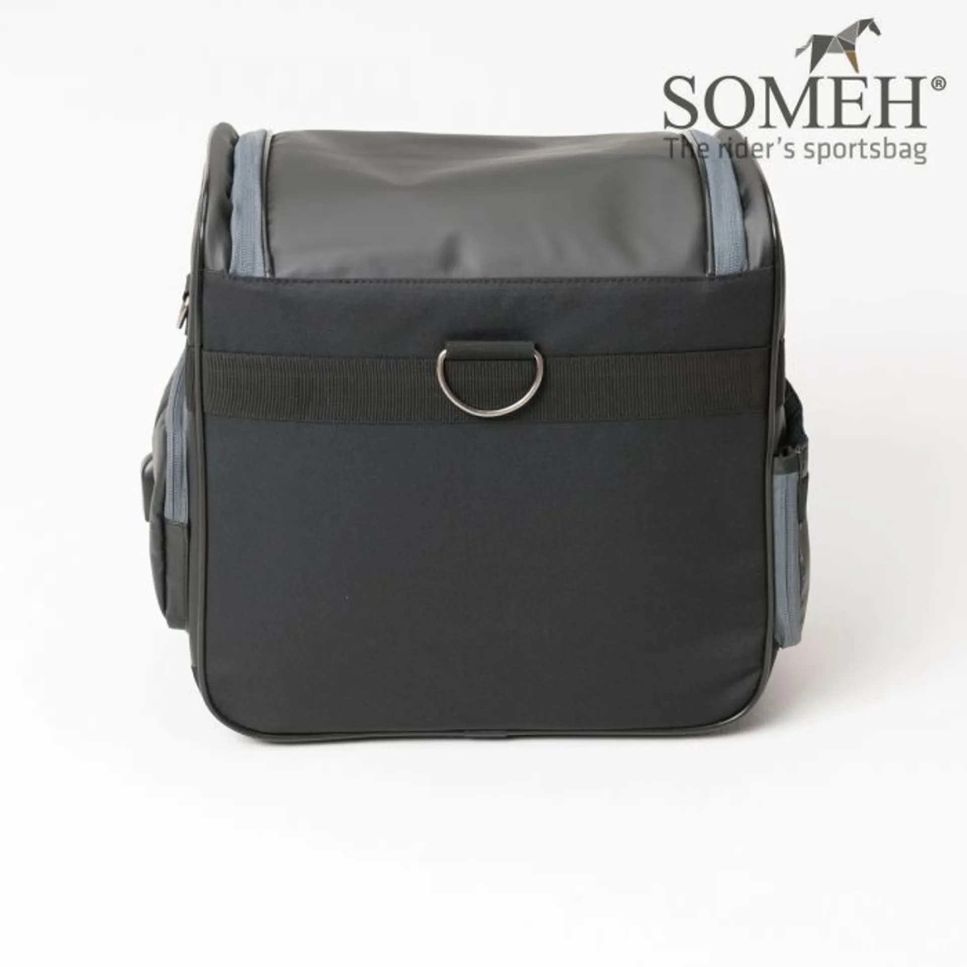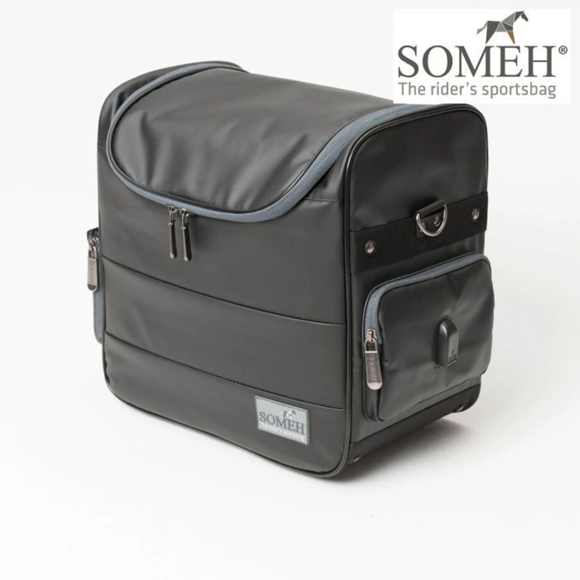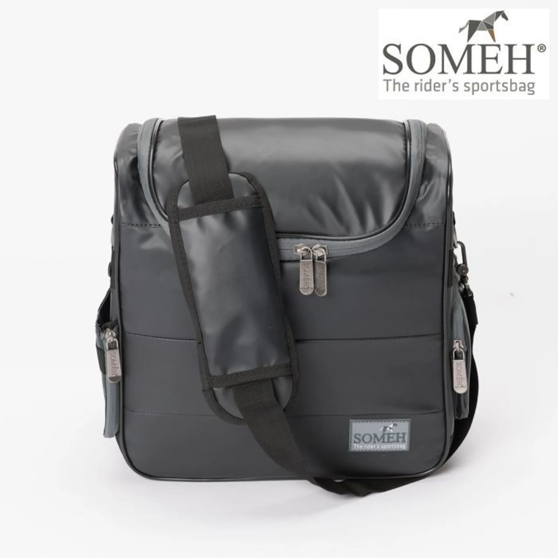 Made of fabric that repels dirt and water, it is strong and durable and has the bonus of rubber feet so you can put it down anywhere without worrying about the ground. An ergonomically designed strap completes the bag so that you can have it comfortably on your shoulder leaving your hands free to groom your horse.