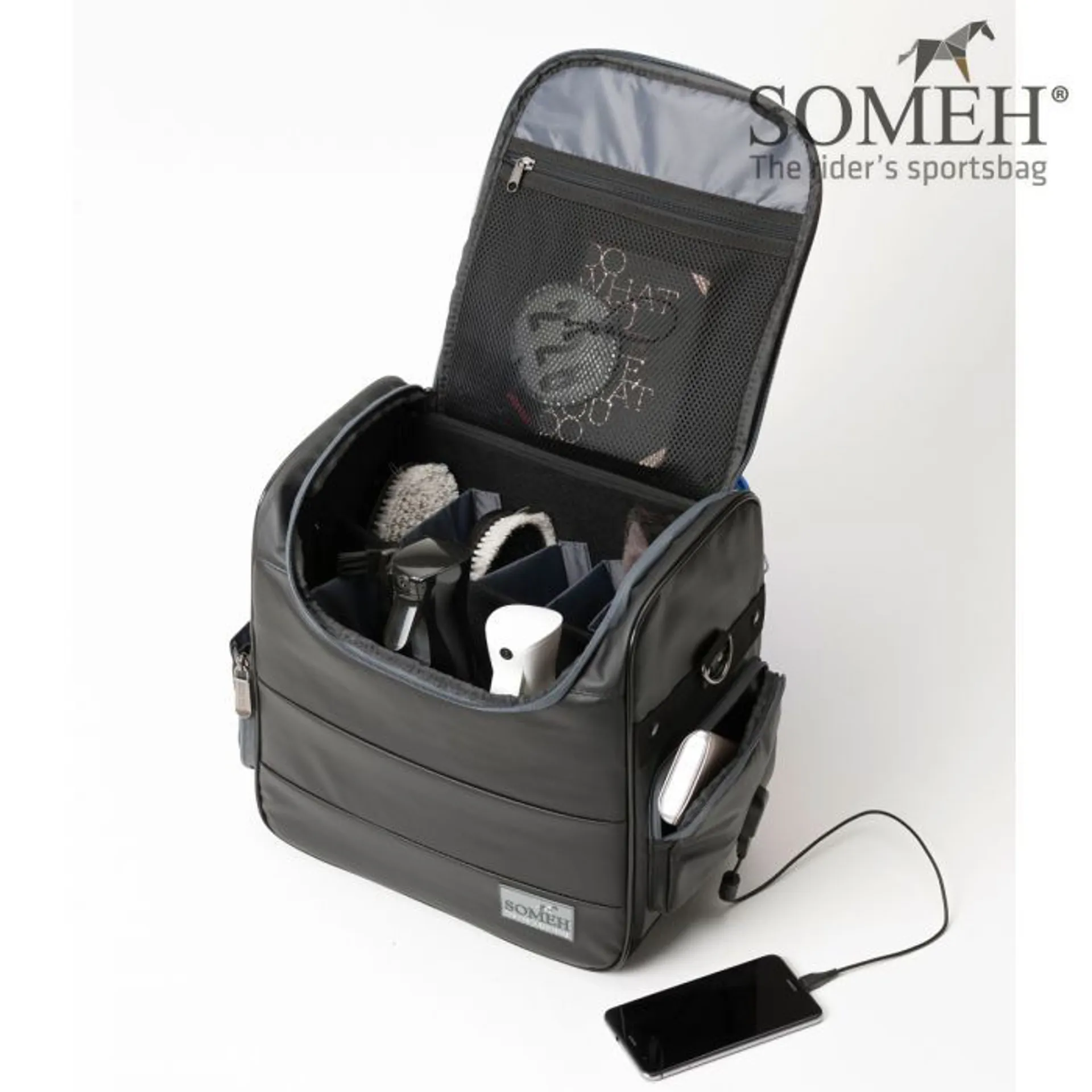 This beautiful grooming bag is the best place for safe storage of your favourite horse grooming products.It keeps all your brushes, sprays, bottles and horse care products tidy, clean and up right at hand when needed.